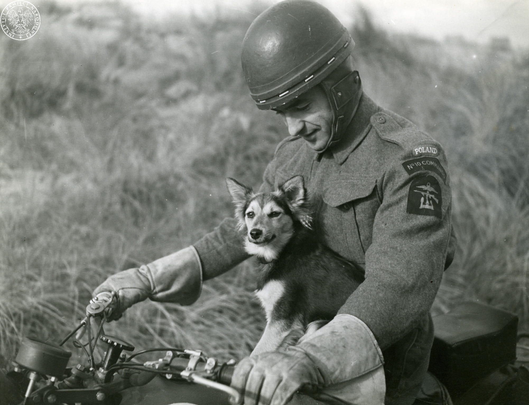 Ppor. Adam Bachleda-Curuś, żołnierz 1. Samodzielnej Kompanii Komandosów (No. 6 Troop No. 10 Inter-Allied Commando), na motocyklu z maskotką kompani – psem Myszką, 1942 r. (fot. z zasobu AIPN)