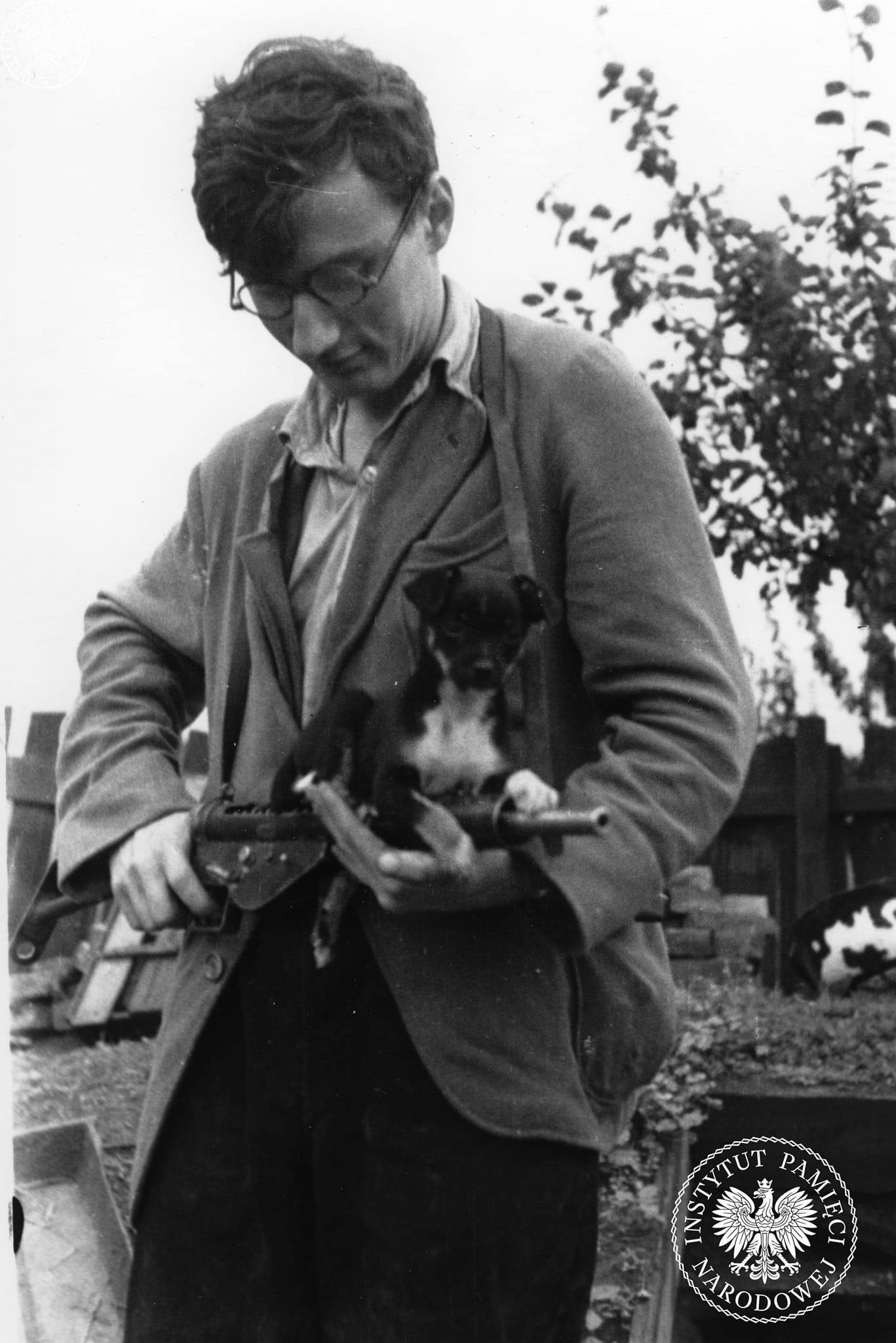 Kpr. pchor. Stanisław Woźniak ps. „Panurg” ze zgrupowania Armii Krajowej „Kampinos” z pieskiem na rękach, 2 sierpnia 1944 r. (fot. z zasobu AIPN)