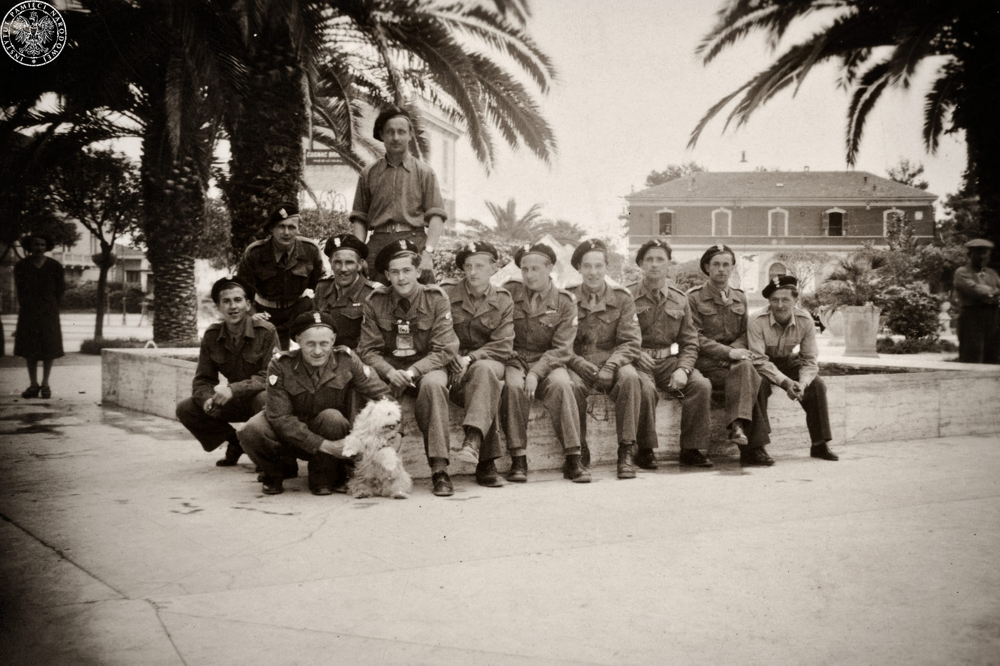 Kapral Michał Bar (z pieskiem) z kolegami podczas służby w 2. Warszawskiej Dywizji Pancernej we Włoszech, ok. 1945 r. (fot. z zasobu AIPN)