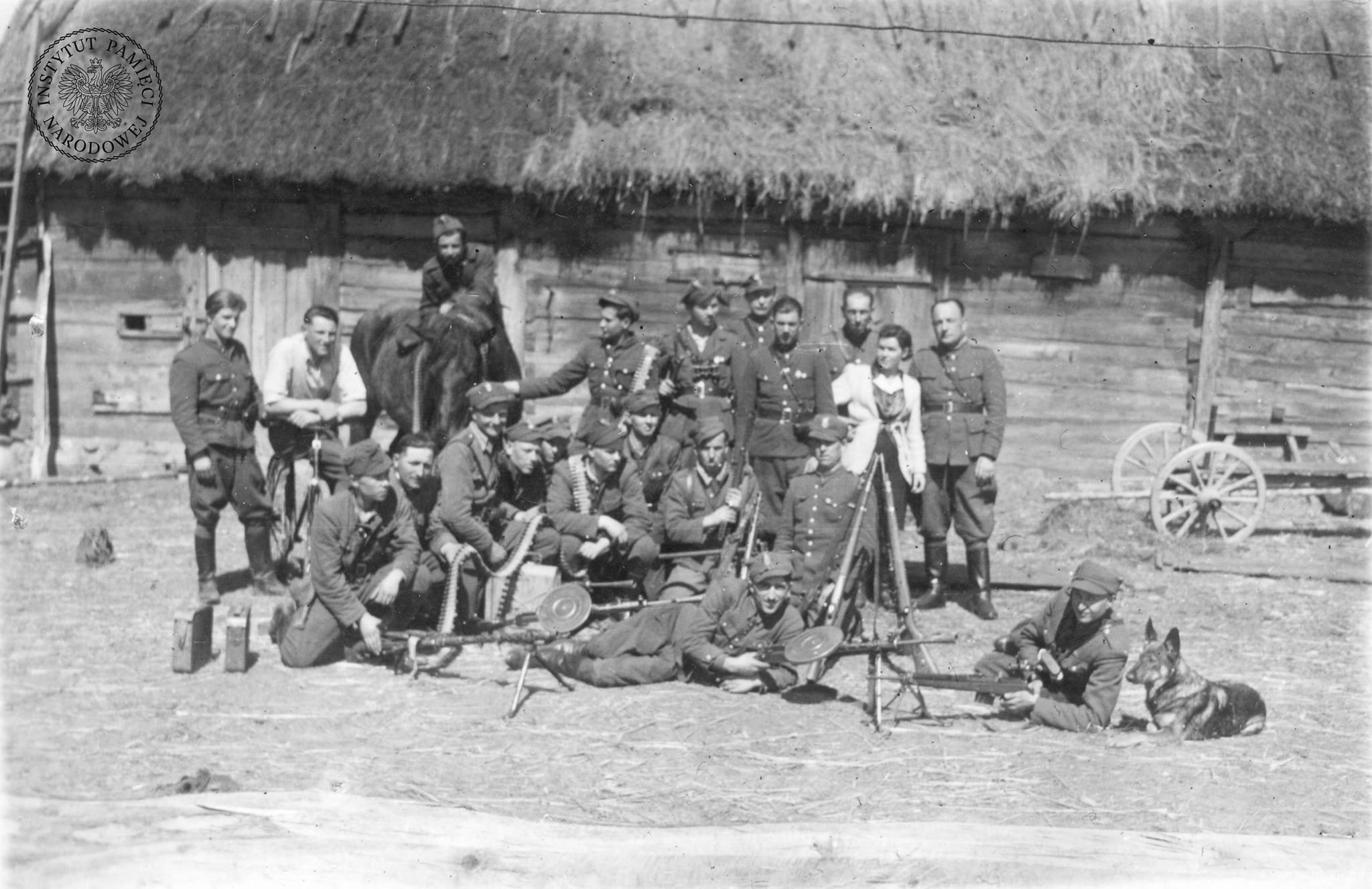 ołnierze, skupieni wokół dowódcy 5. Wileńskiej Brygady Armii Krajowej mjr. Zygmunta Szendzielarza ps. „Łupaszka”, pozują do zdjęcia z psem, 24 kwietnia 1946 r. (fot. z zasobu AIPN)