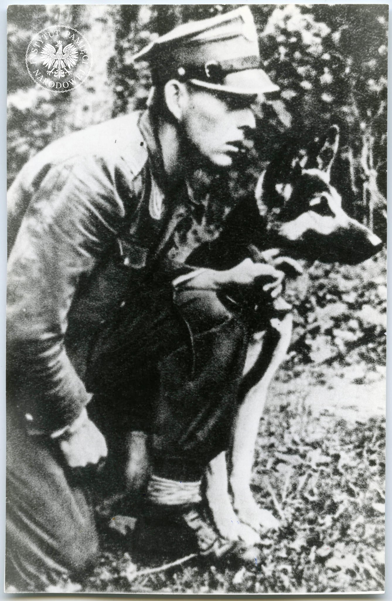 Żołnierz AK, ROAK, NZW, dowódca oddziału bojowego 11. Grupy Operacyjnej NSZ (NZW), sierż. Wiktor Stryjewski ps. „Cacko” z psem, b.d. (fot. z zasobu AIPN)