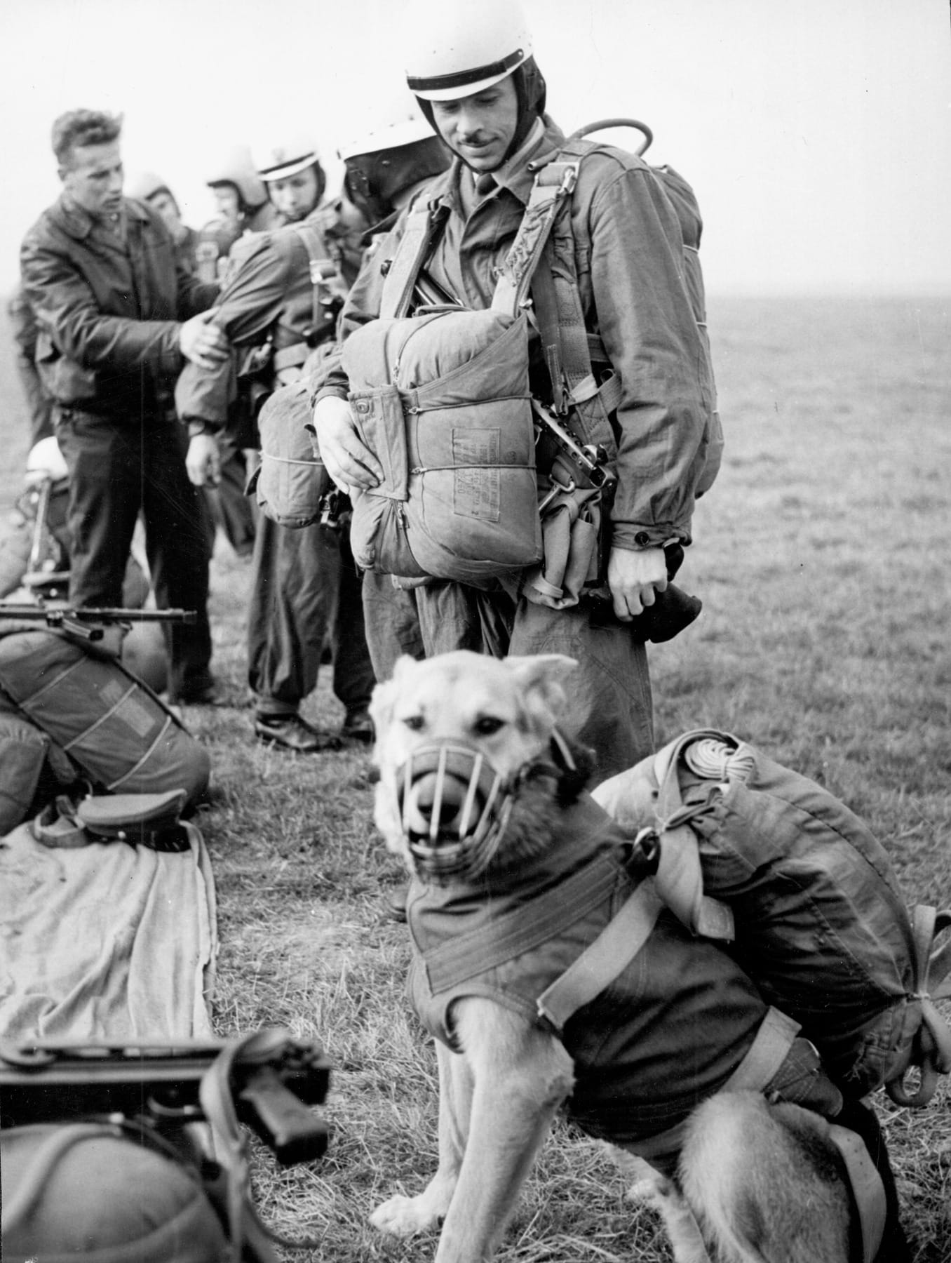 Funkcjonariusze Milicji Obywatelskiej w czasie przeszkolenia spadochronowego, na pierwszym planie pies rasy owczarek niemiecki, b.d. Fot. CAF (fot. z zasobu AIPN)
