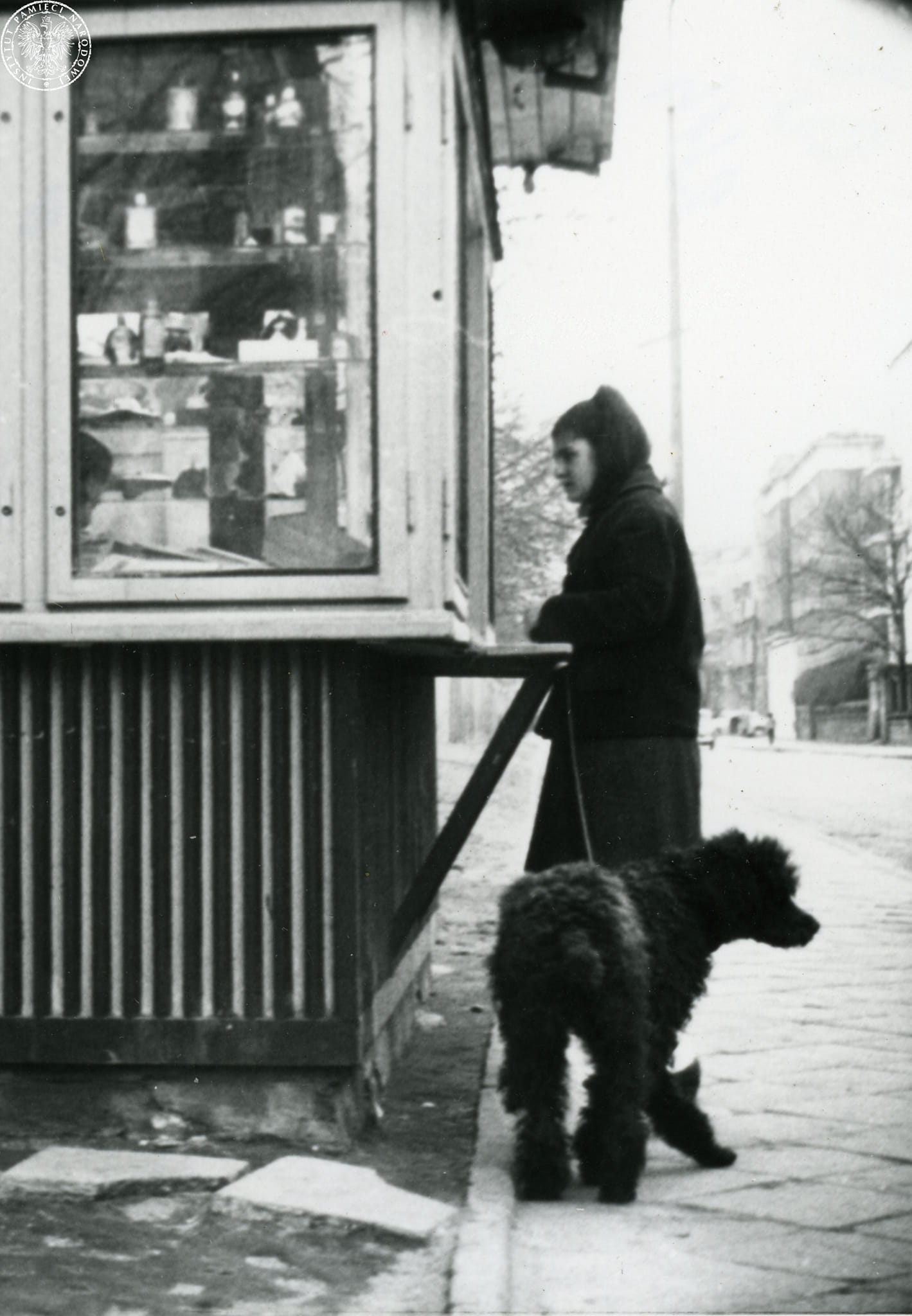 Obserwacja operacyjna osób związanych z działalnością Karola Modzelewskiego, Jacka Kuronia i Adama Michnika. Na zdjęciu Magdalena Czaplicka- Wieczorek (fig. ps. „Róża”), w trakcie spaceru z psem, stoi przy kiosku „Ruchu” na ul. Kaliskiej w Warszawie, 2 kwietnia 1964 r. (fot. z zasobu AIPN)