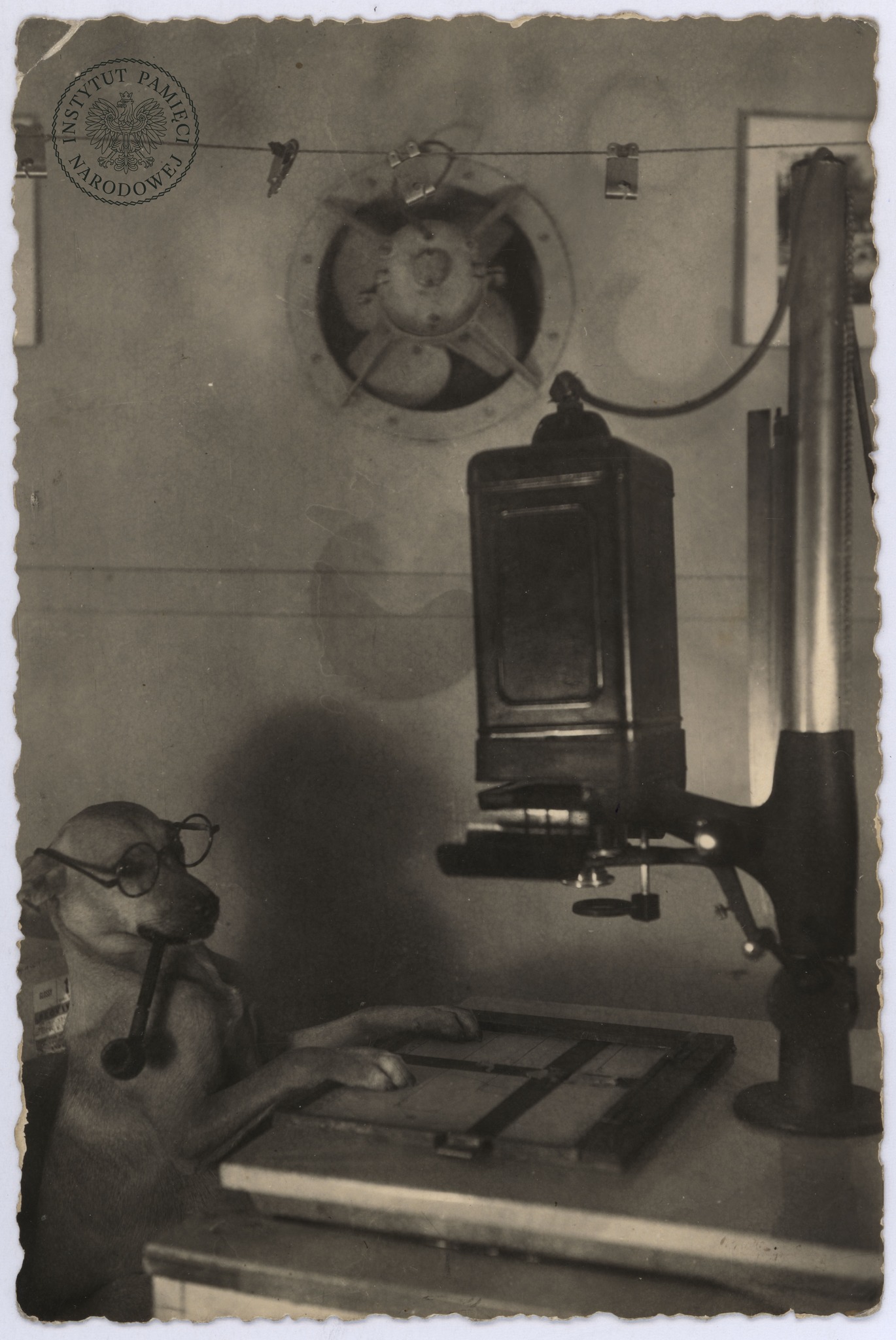 Pies (z fajka w pysku i w okularach) w ciemni zakładu fotograficznego Henryka Śmigacza przy ul. Piotrkowskiej 6 w Łodzi. Fot. H. Śmigacz (fot. z zasobu AIPN)