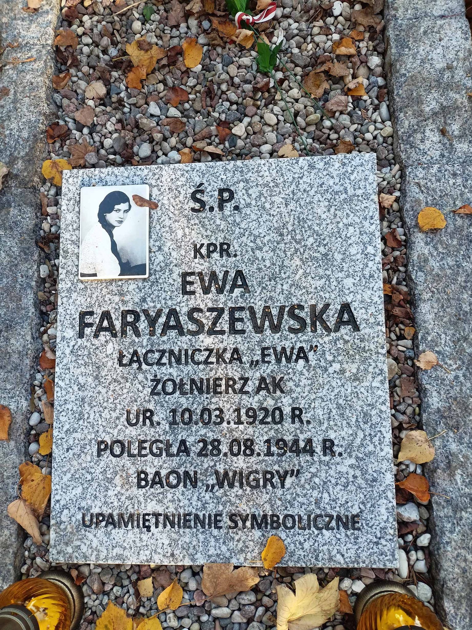 Ewa Faryaszewska została pochowana tymczasowo na tzw. Międzymurzu na Starym Mieście wraz z kpr. pchor. Leszkiem Świderskim. Po wojnie została ekshumowana do grobu rodzinnego na Starych Powązkach.