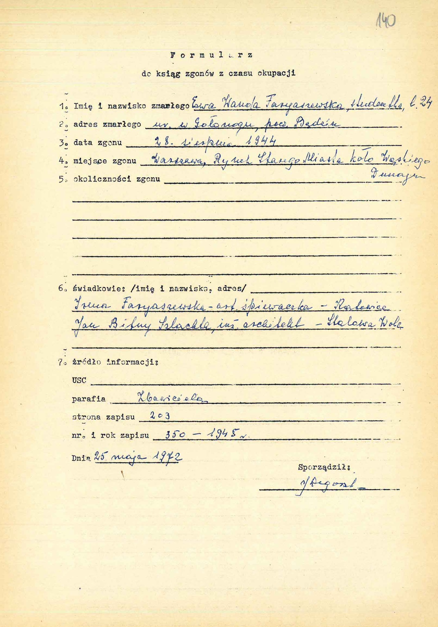 W zasobie Archiwum IPN znajdują się „Formularze do ksiąg zgonów z okresu okupacji Parafii Zbawiciela w Śródmieściu”, w których odnotowano śmierć Ewy Faryaszewskiej.