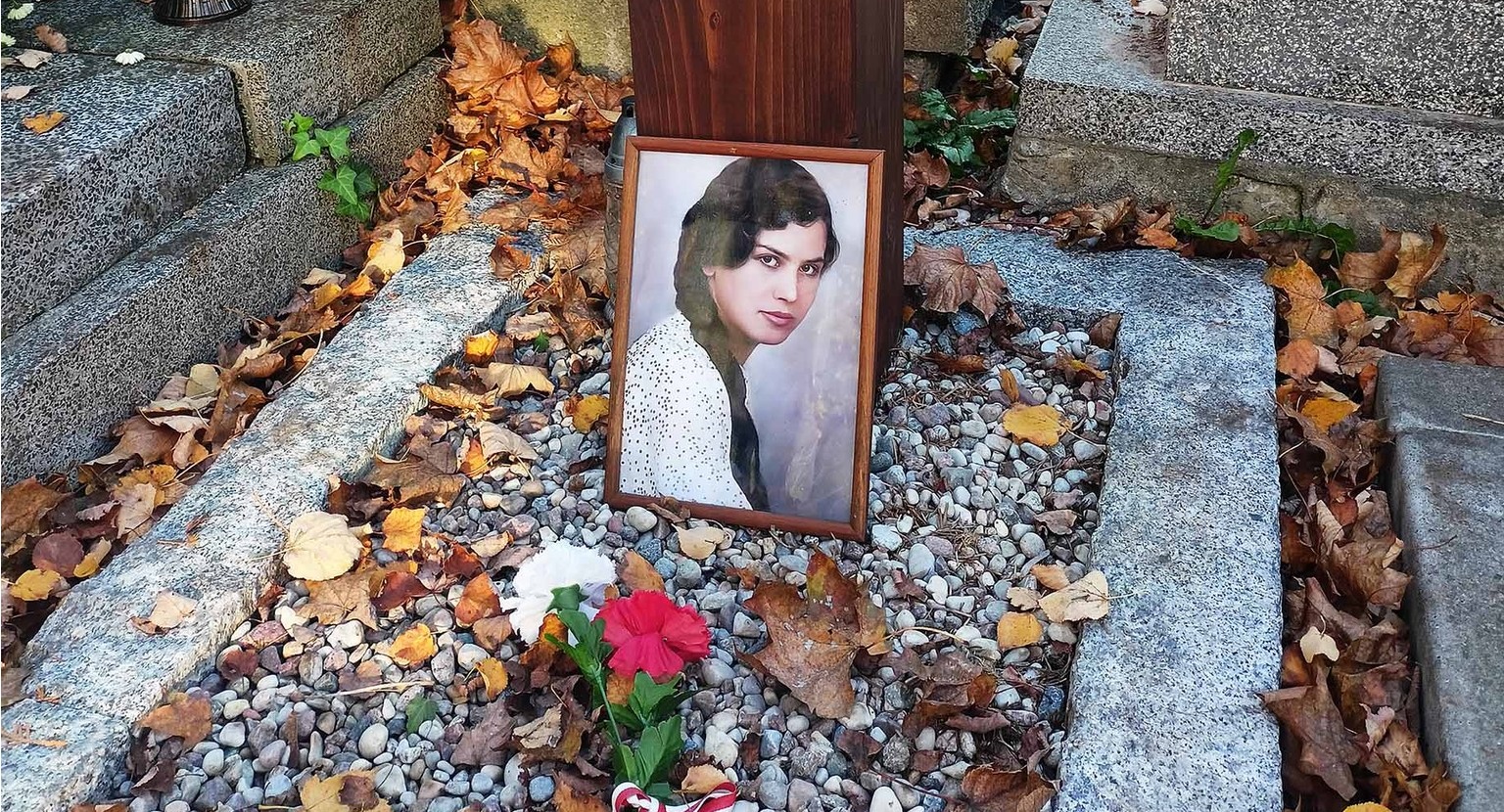 Zdjęcie Ewy Faryaszewskiej przy krzyżu nad symbolicznym grobem w kwaterze żołnierzy batalionu „Zośka” na warszawskich Powązkach Wojskowychh, 2024 r. (fot. K.M.)