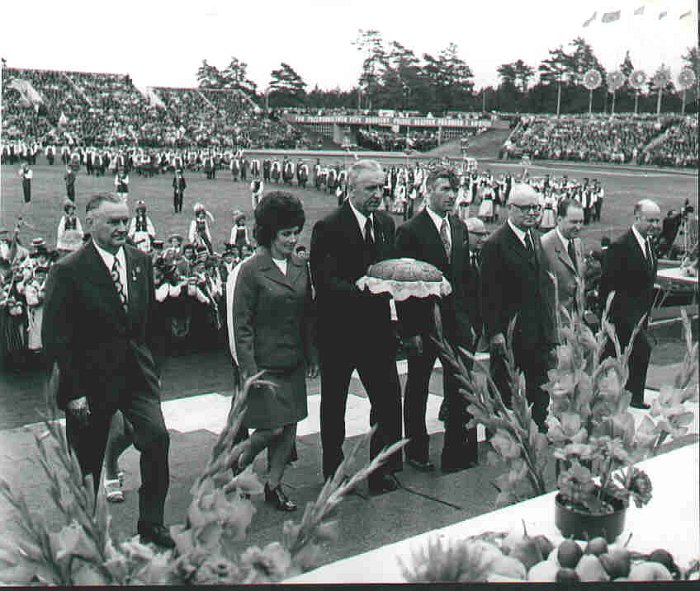 Pierwszemu sekretarzowi dożynkowy bochen chleba, który był symbolem dobrobytu, dostatku, urodzaju, owocu i trudu, jaki polscy rolnicy włożyli w swoją pracę, przekazali starosta i starościna dożynek.