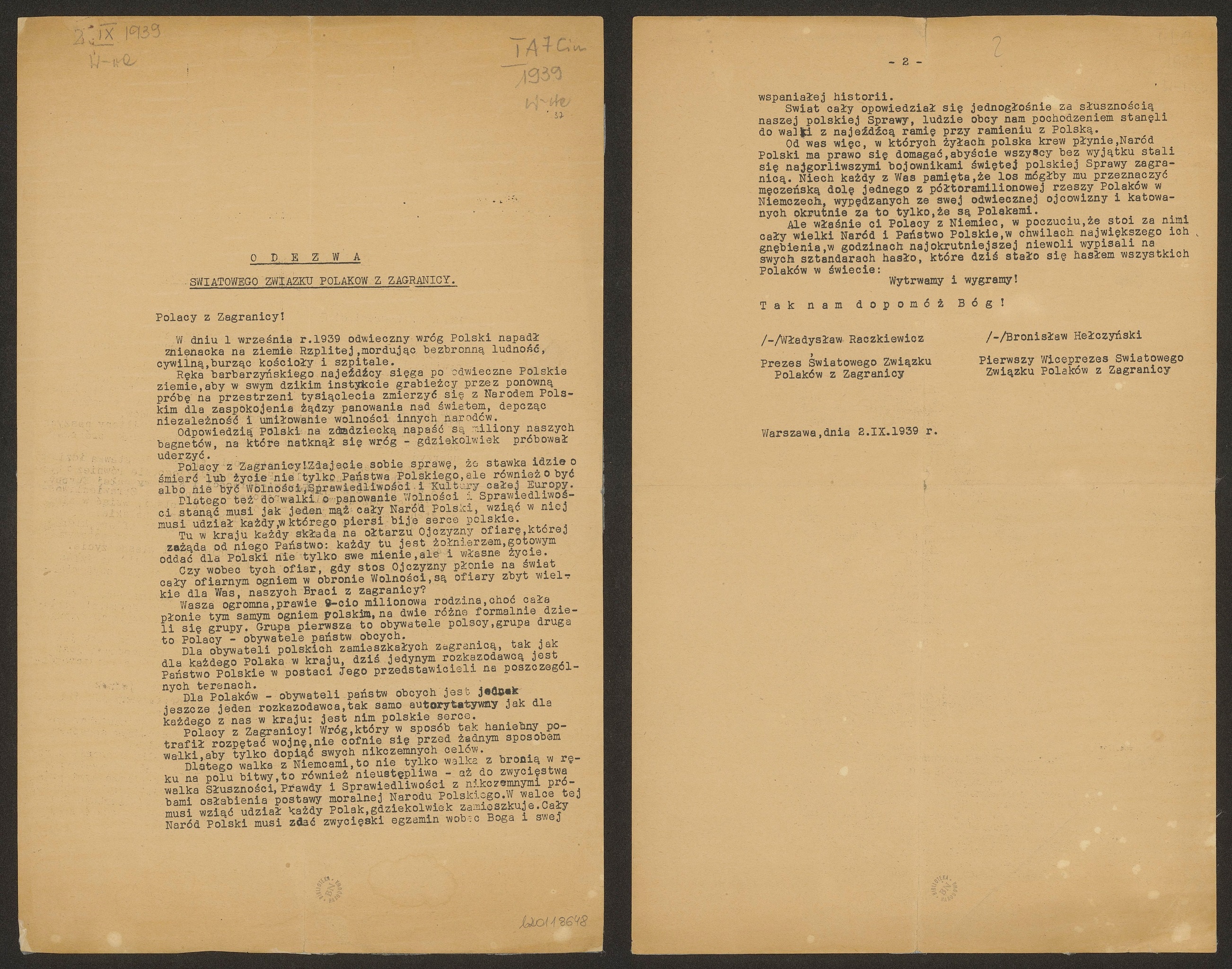 Pierwsza strona Odezwa Światowego Związku Polaków z Zagranicy (Światpolu) dotycząca pomocy Polonii dla zaatakowanej ojczyzny, podpisana przez prezesa Światpolu Władysława Raczkiewicza i pierwszego wiceprezesa tej organizacji Bronisława Hełczyńskiego. Warszawa, 2 września 1939 r. (ze zbiorów Biblioteki Narodowej – Polona)