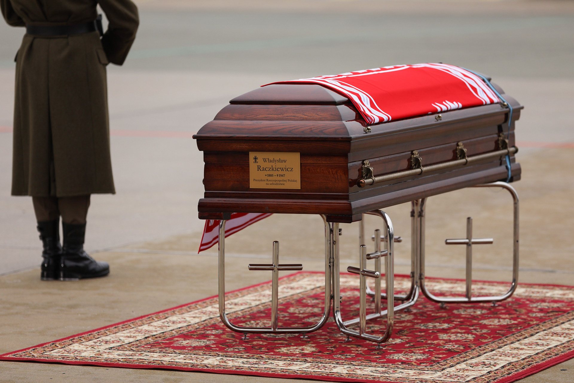 Trumna ze szczątkami Władysława Raczkiewicza podczas uroczystości powitania na lotnisku Okęcie w Warszawie przed uroczystym pogrzebem prezydentów RP. 12 listopada 2022 r. (fot. Mikołaj Bujak, IPN)