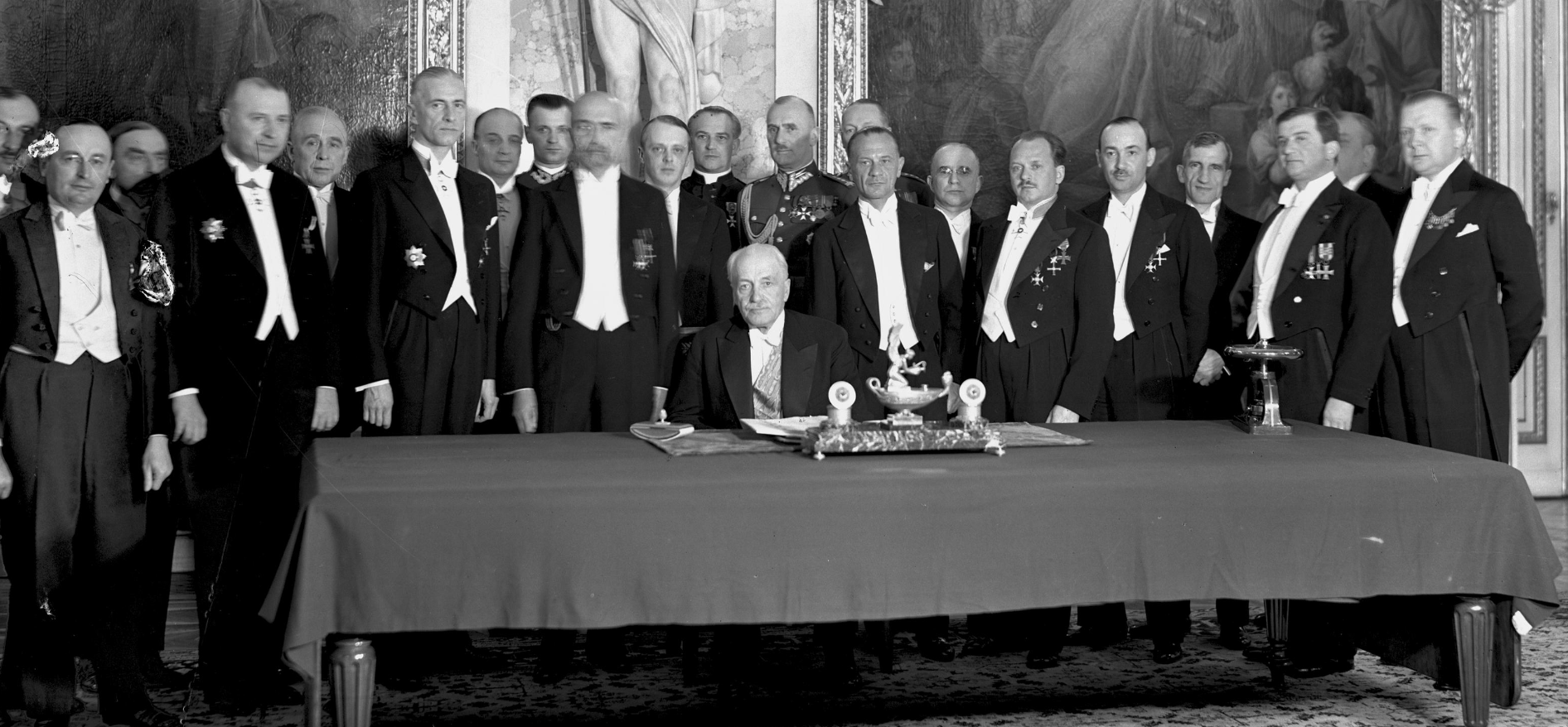 Podpisanie układu polsko-sowieckiego o nawiązaniu stosunków dyplomatycznych. Londyn, 30 lipca 1941 r. Za stołem siedzą od lewej: premier RP i Naczelny Wódz gen. Władysław Sikorski, minister spraw zagranicznych Wielkiej Brytanii Anthony Eden, premier Wielkiej Brytanii Winston Churchill, NN, ambasador ZSRS w Wielkiej Brytanii Iwan Majski. (fot. ze zbiorów NAC)
