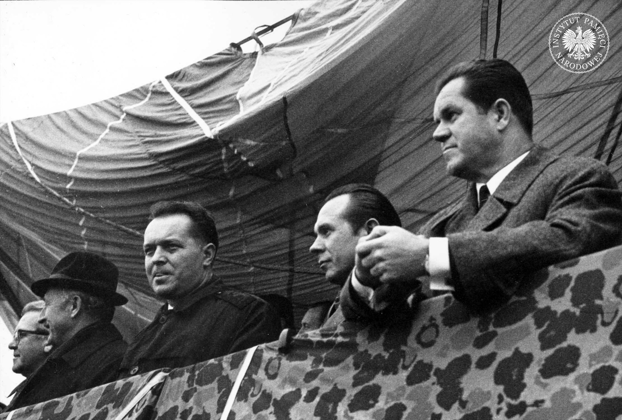 Pokaz działania oddziałów zwartych milicji obserwowali przedstawiciele kierownictwa resoru spraw wewnętrznych oraz PZPR. Od lewej: minister spraw wewnętrznych Kazimierz Świtała, I sekretarz KW PZPR w Krakowie Czesław Domagała, kierownik Wydziału Administracyjnego KC PZPR Stanisław Kania i (pierwszy od prawej) wiceminister spraw wewnętrznych Franciszek Szlachcic. Kraków Czyżyny, 25 października 1969 r. (fot. z zasobu AIPN)