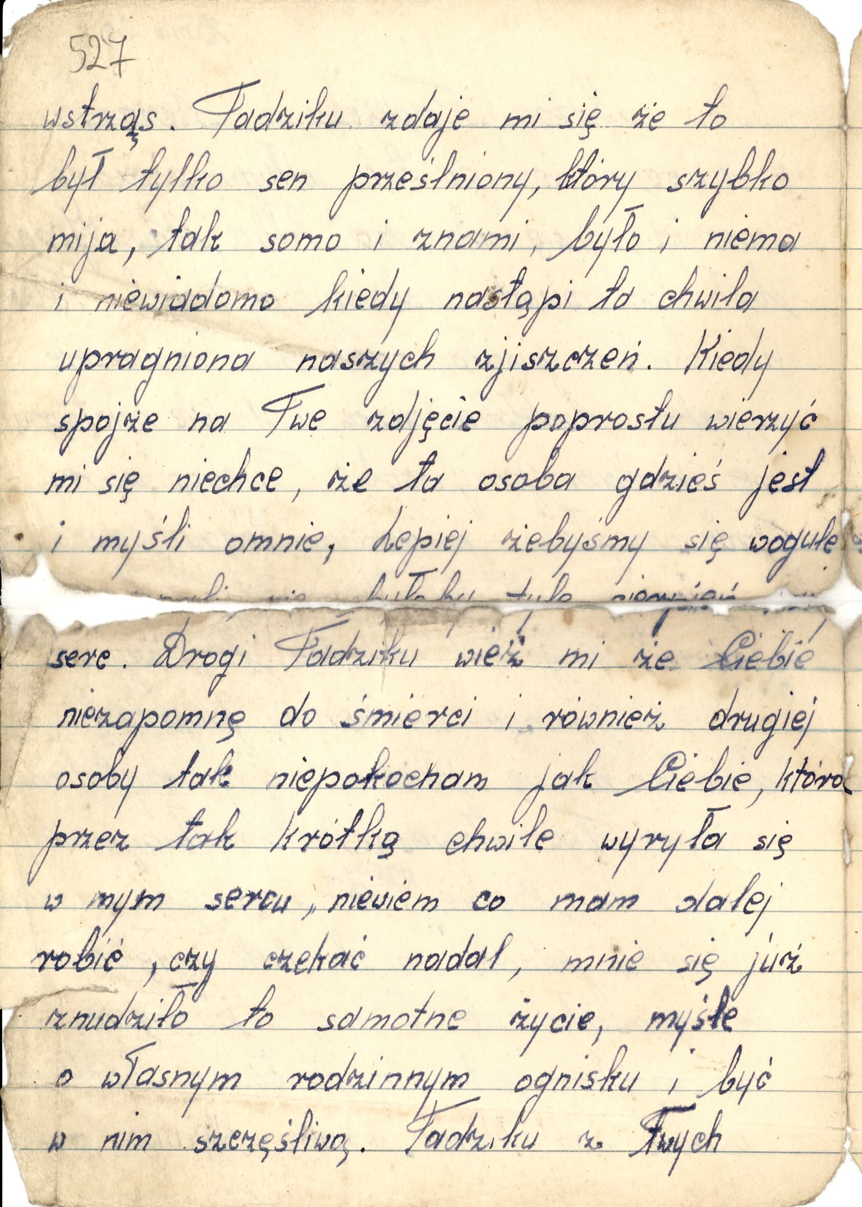 „[…] Drogi Tadziu wierz mi, że Ciebie nie zapomnę do śmierci i również drugiej osoby tak nie pokocham jak Ciebie”, „żal mi jest Ciebie ażeby z drugą osobą zawrzeć małżeństwo i łudzę się nadzieją, że może niedługo będziemy szczęśliwi”13.