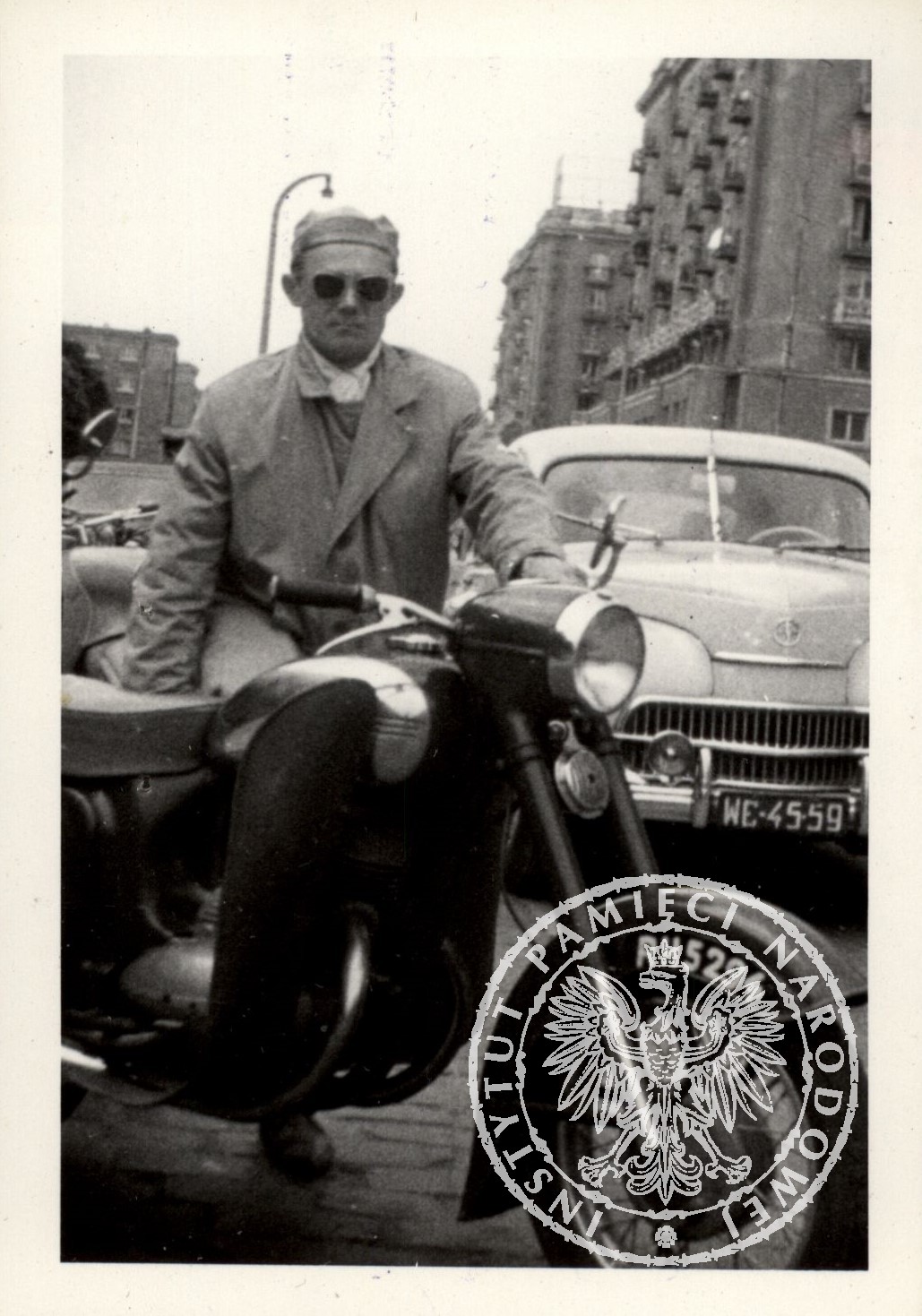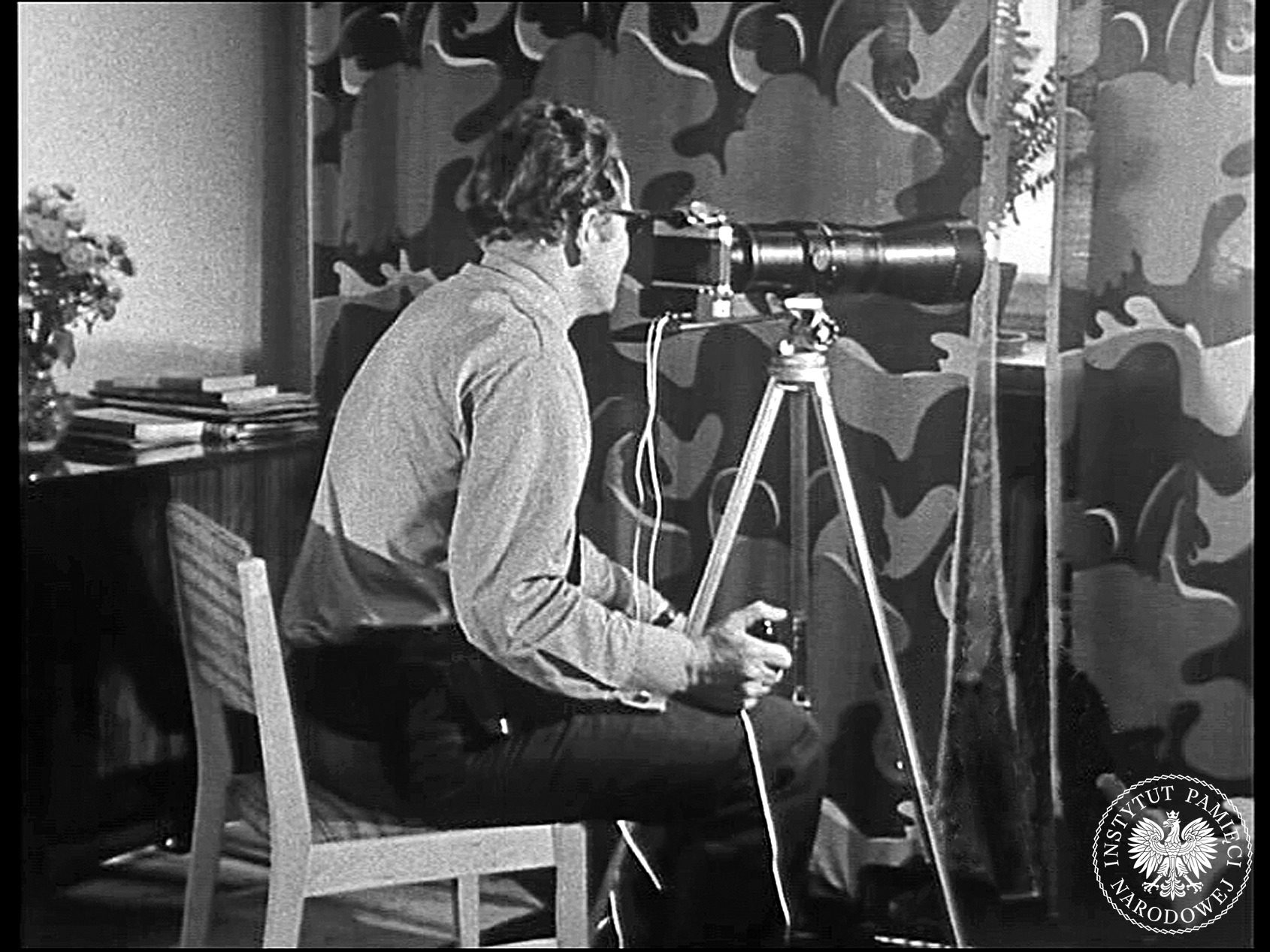Zdjęcie funkcjonariusza w trakcie obserwacji. Kadr z filmu szkoleniowego pt. „Pentacon Super”. Film, zrealizowany na potrzeby Ośrodka Nauczania Obserwacji Ministerstwa Spraw Wewnętrznych, przedstawia opis obsługi aparatu fotograficznego Pentacon Super wraz z dodatkowym wyposażeniem oraz techniki i sposoby wykonywania przez wywiadowców zdjęć z ruchomych i stałych punktów zakrytych (z zasobu IPN)