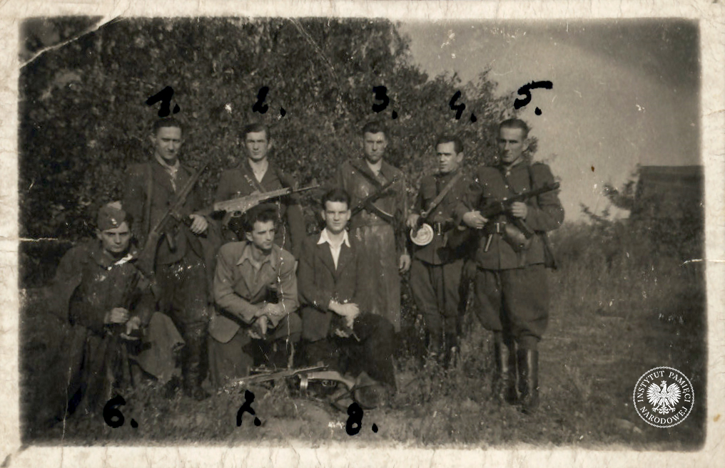 Patrol bojowy 11. Grupy Operacyjnej NSZ (NZW). Na zdjęciu znajdują się: Tadeusz Kosobudzki „Czarny” (oznaczony cyfrą 1), Wiesław Purzycki „Tyczka”, „Ojciec” (2), Wacław Michalski „Kozak” (3), Kazimierz Dyksiński „Kruczek” (4), Jan Malinowski „Stryj” (5), Seweryn Oryl „Kanciasty” (6), Władysław Kwiatkowski „Jerzy” (7), Karol Rakoczy „Karol”, „Bystry” (8 ), (fot. z zasobu IPN)