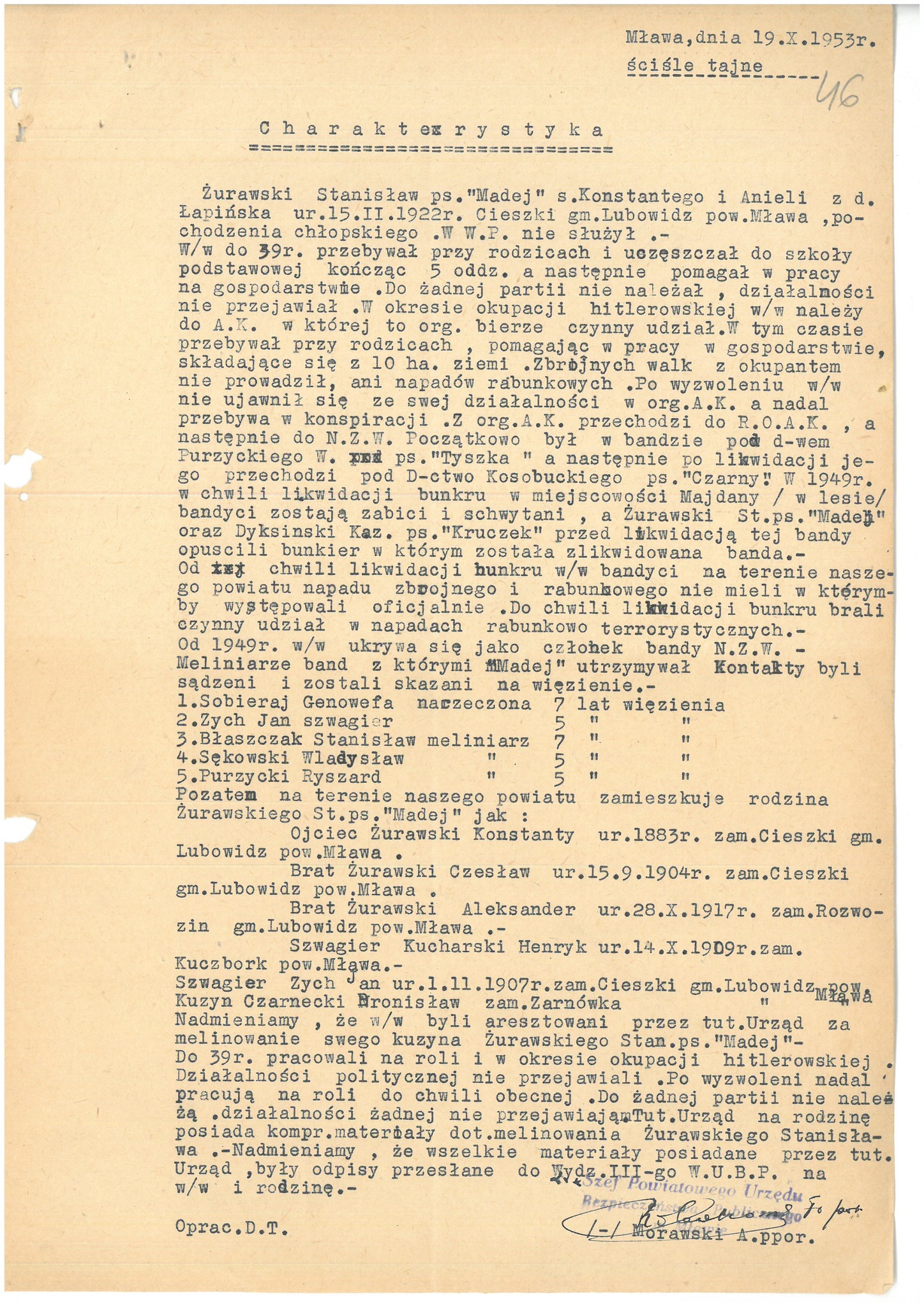 Charakterystyka Stanisława Żurawskiego „Madeja” sporządzona w PUBP w Mławie 19 X 1953 r. Dokument z akt kontrolnych „agenturalnego rozpracowania p-ko bandzie »Kruczka« i »Madeja« krypt. »Łazęgi«” (z zasobu IPN)