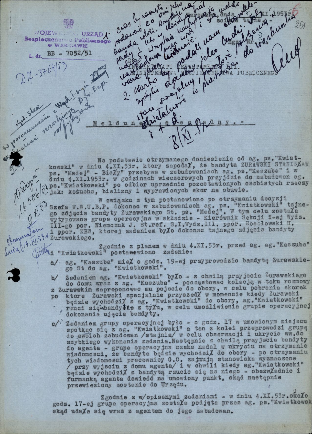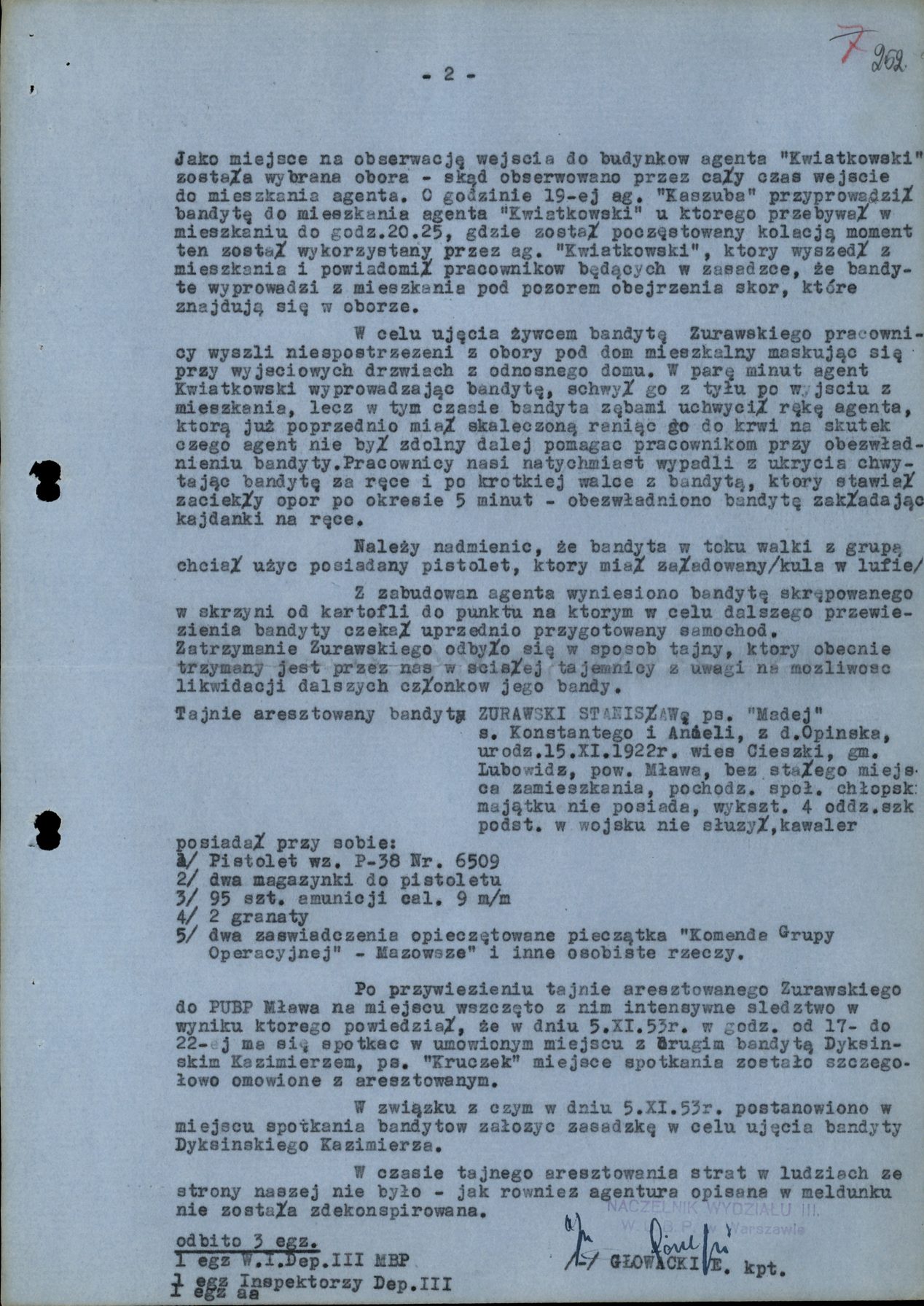 Meldunek specjalny kpt. Eugeniusza Głowackiego, naczelnika Wydziału III WUBP w Warszawie, dotyczący ujęcia Stanisława Żurawskiego „Madeja”. Warszawa, 7 XI 1953 r. Dokument z akt kontrolnych sprawy agenturalnego rozpracowania krypt. „Łazęgi” (z zasobu IPN)