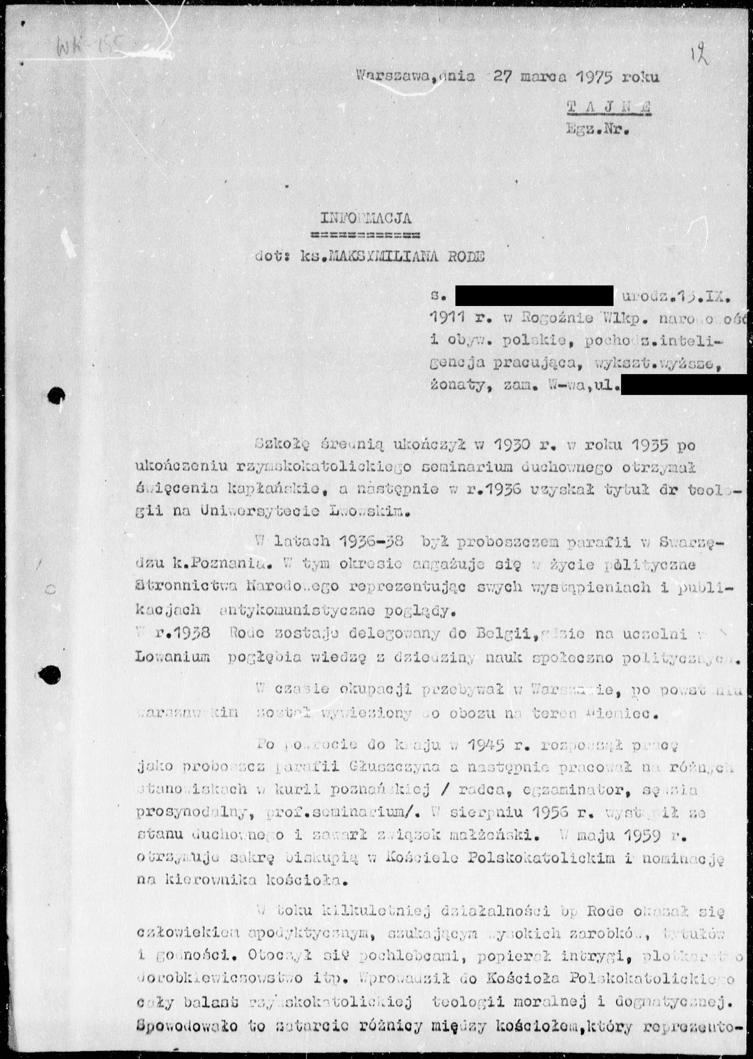 „[ks. Rode] Szuka drogi pojednania z Kościołem kat[olickim] ale jest obstawiony przez UdsW i nie ma swobody działania. Boi się utracić dochody. Ocena ks[iędza Jakuba Gawrycha – dop. M.Sz.] z Żonia: jest w ciężkiej sytuacji, przyznaje, że źle zrobił, chce naprawić szkody wyrządzone Kościołowi i dane zgorszenie. Jeśli choroba nie będzie go przyciskać, będzie szukał pojednania; jeżeli stan zdrowia się poprawi – może jeszcze zwlekać. […] Gotów jestem przyjąć jego powrót, ułatwić mu wszystko, zapewnić środki bytowania i leczenia jemu osobiście”.