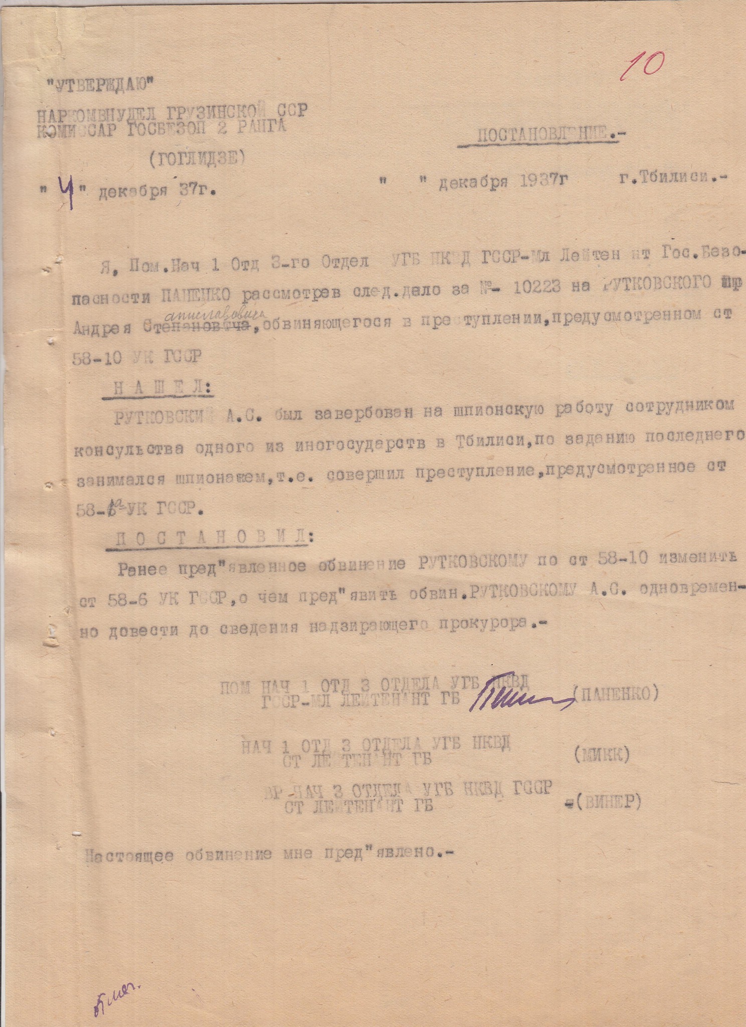 Ostatecznie sprawie nadano zabarwienie narodowościowe i zgodnie z rozkazem 00485 Andrzej Rutkowski został 3 stycznia 1938 r. skazany przez „najwyższą dwójkę” (protokół nr 696) na najwyższy wymiar kary i 14 stycznia tegoż roku rozstrzelany w Tbilisi.