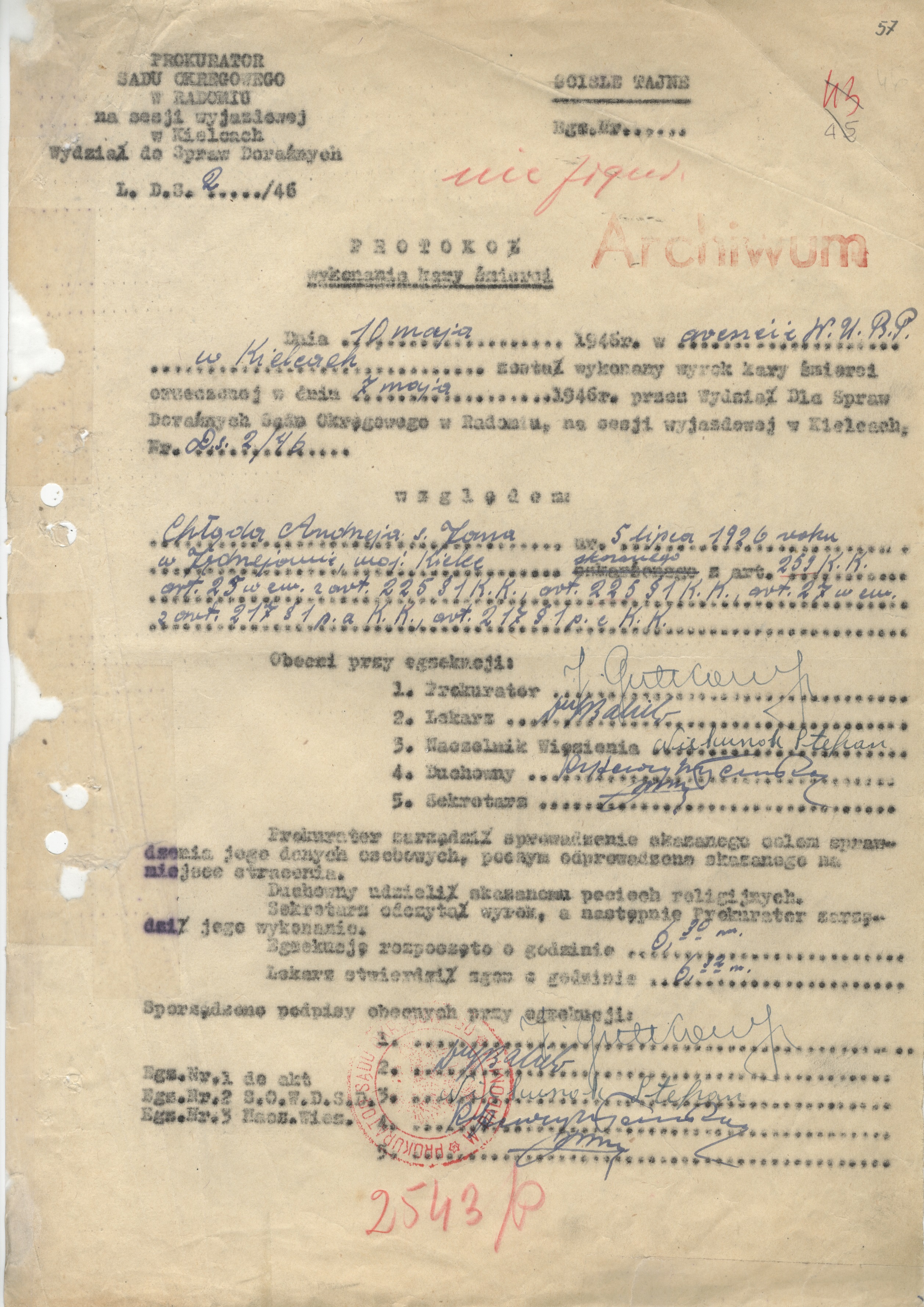 Sąd Rejonowy w Radomiu 7 maja 1946 r. wydał bardzo surowe wyroki. Andrzej Chlond i jego trzech kolegów zostało skazanych na karę śmierci i zamordowanych w areszcie WUBP w Kielcach trzy dni po orzeczeniu wyroku.