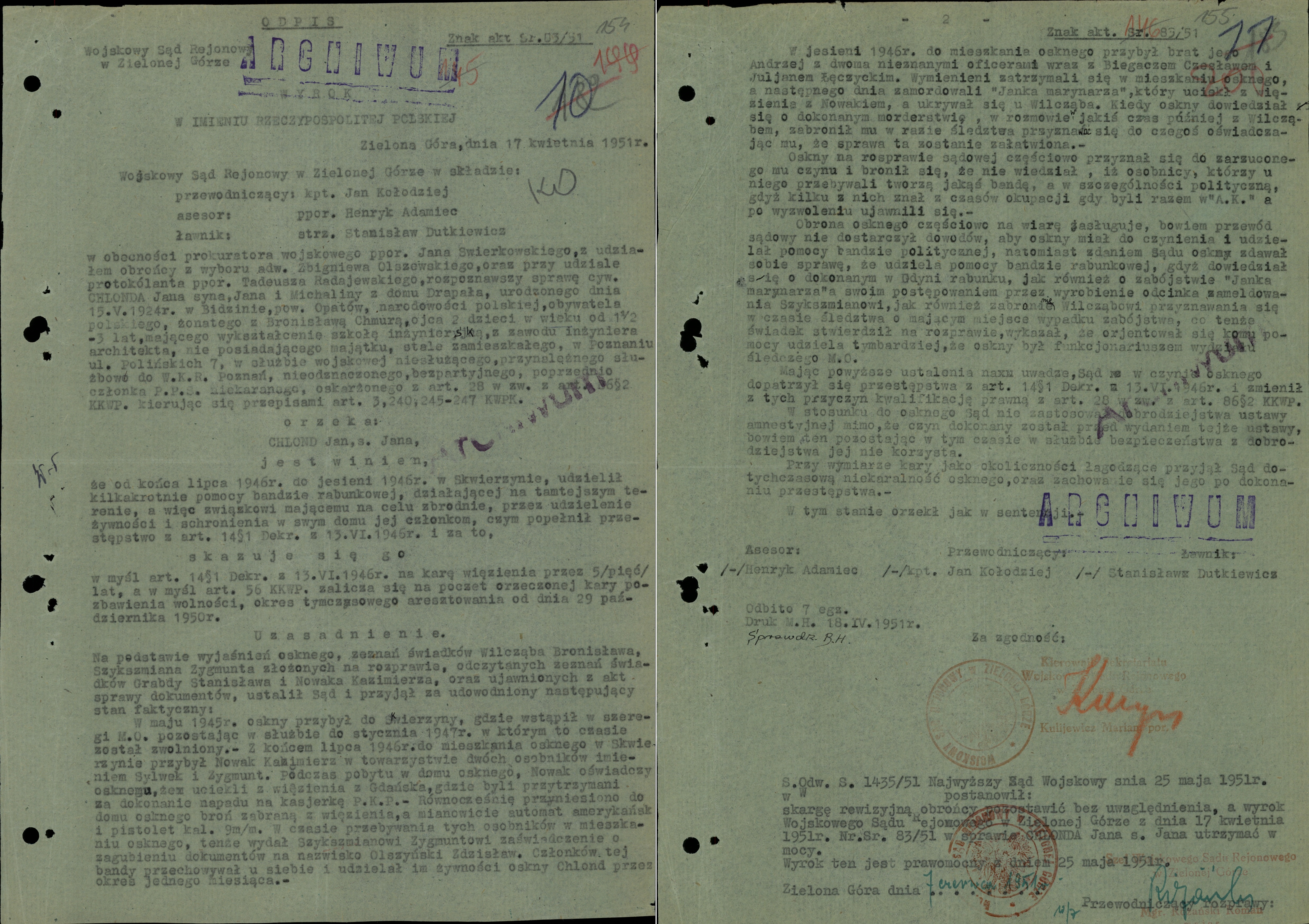 Szokująca okazała się decyzja Sądu Rejonowego w Zielonej Górze, który 16 lipca 1991 r. oddalił wniosek Chlonda, uznając wyrok komunistycznego sądu za prawomocny (!). W uzasadnieniu użyto obraźliwej sentencji, uznając Chlonda za członka „bandy rabunkowej”.