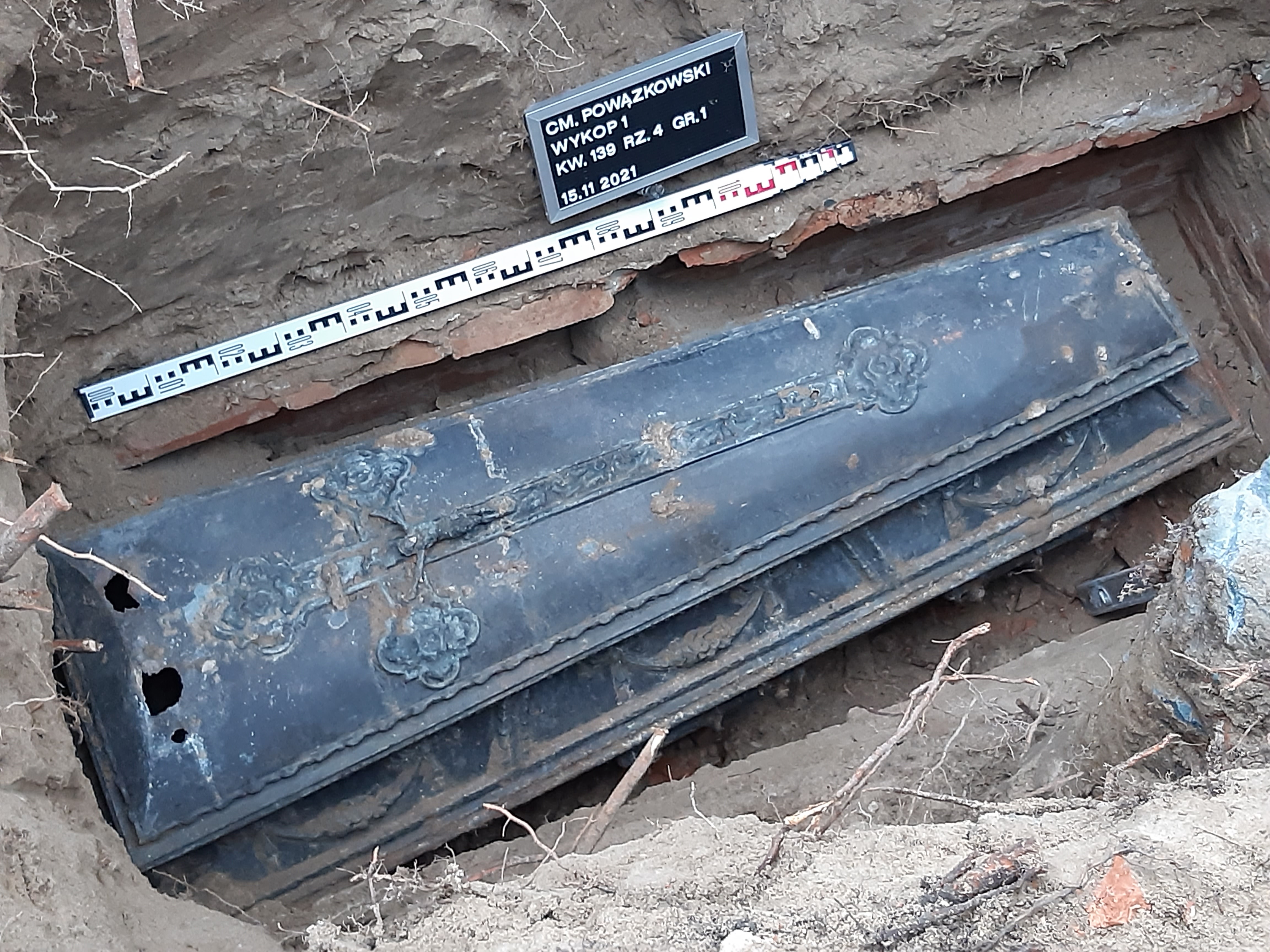 Prace ekshumacyjne w grobie Marszałka Edwarda Śmigłego-Rydza na Cmentarzu Powązkowskim w Warszawie, 15 listopada 2021 r. (fot. Biuro Poszukiwań i Identyfikacji IPN)