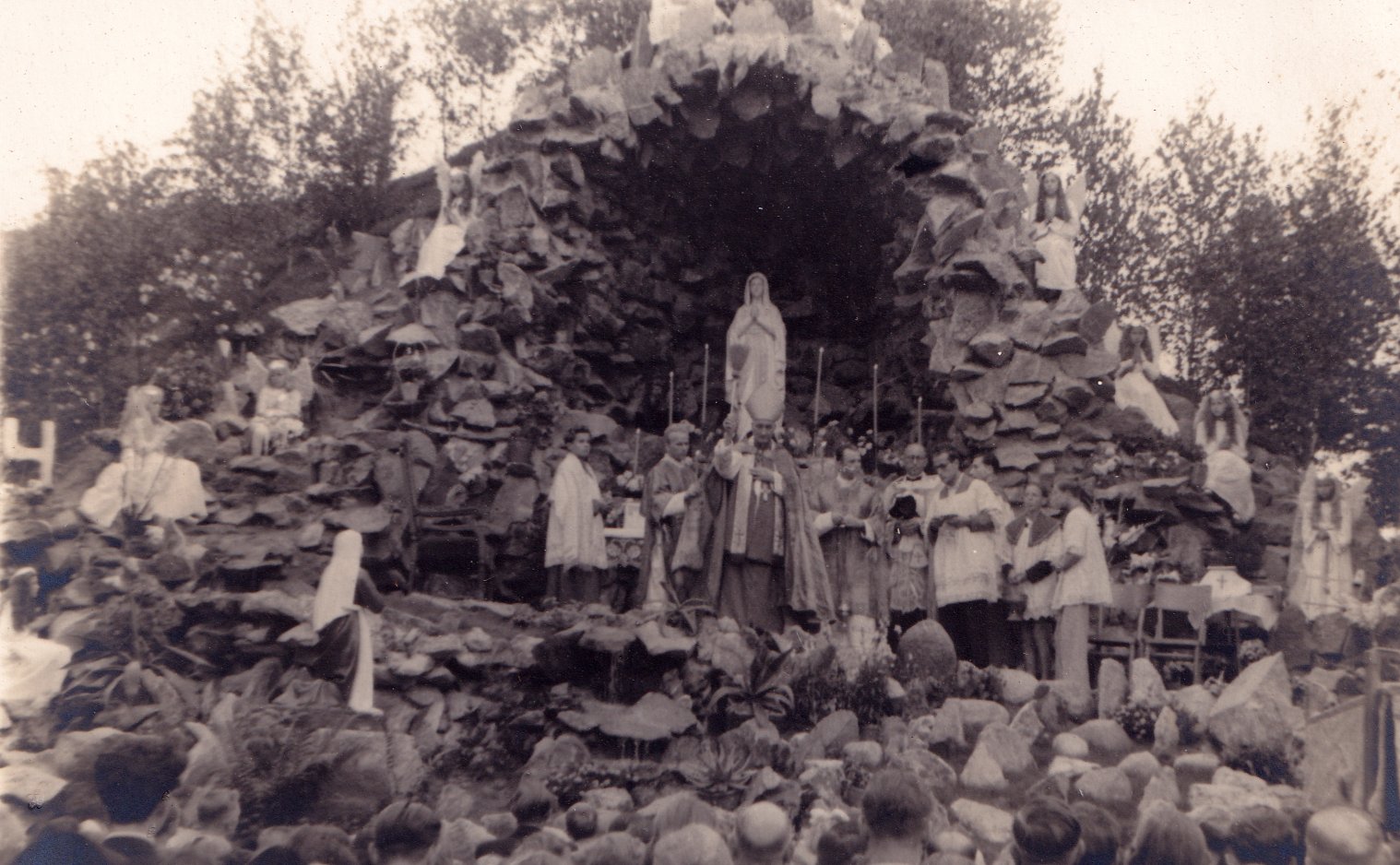 Uroczystość poświęcenia groty Matki Bożej przy kościele Chrystusa Króla w Gdańsku przez ordynariusza diecezji gdańskiej ks. Jana Cymanowskiego, 22 sierpnia 1954 r. Na prawo od niego, z biretem w dłoniach, proboszcz parafii ks. Zygmunt Badowski (fot. z zasobu Archiwum parafii pw. Chrystusa Króla w Gdańsku)