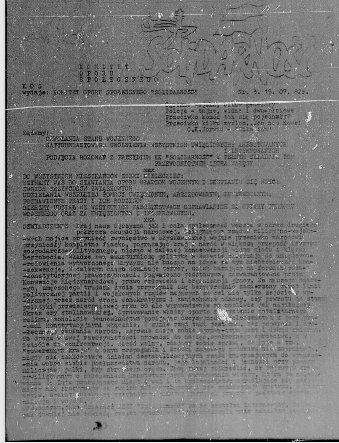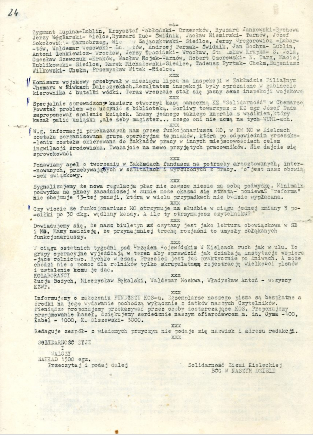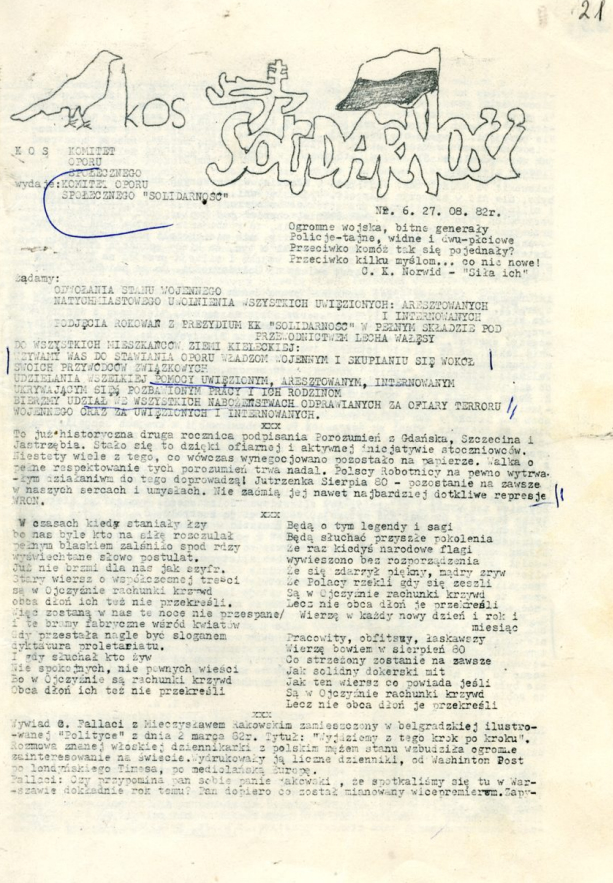 W „KOS-ach” można było również znaleźć apele do mieszkańców o stawianie wobec władzy oraz apele o pomoc materialną dla więzionych i ich rodzin. Jak wspominała Stanisława Gawlik: