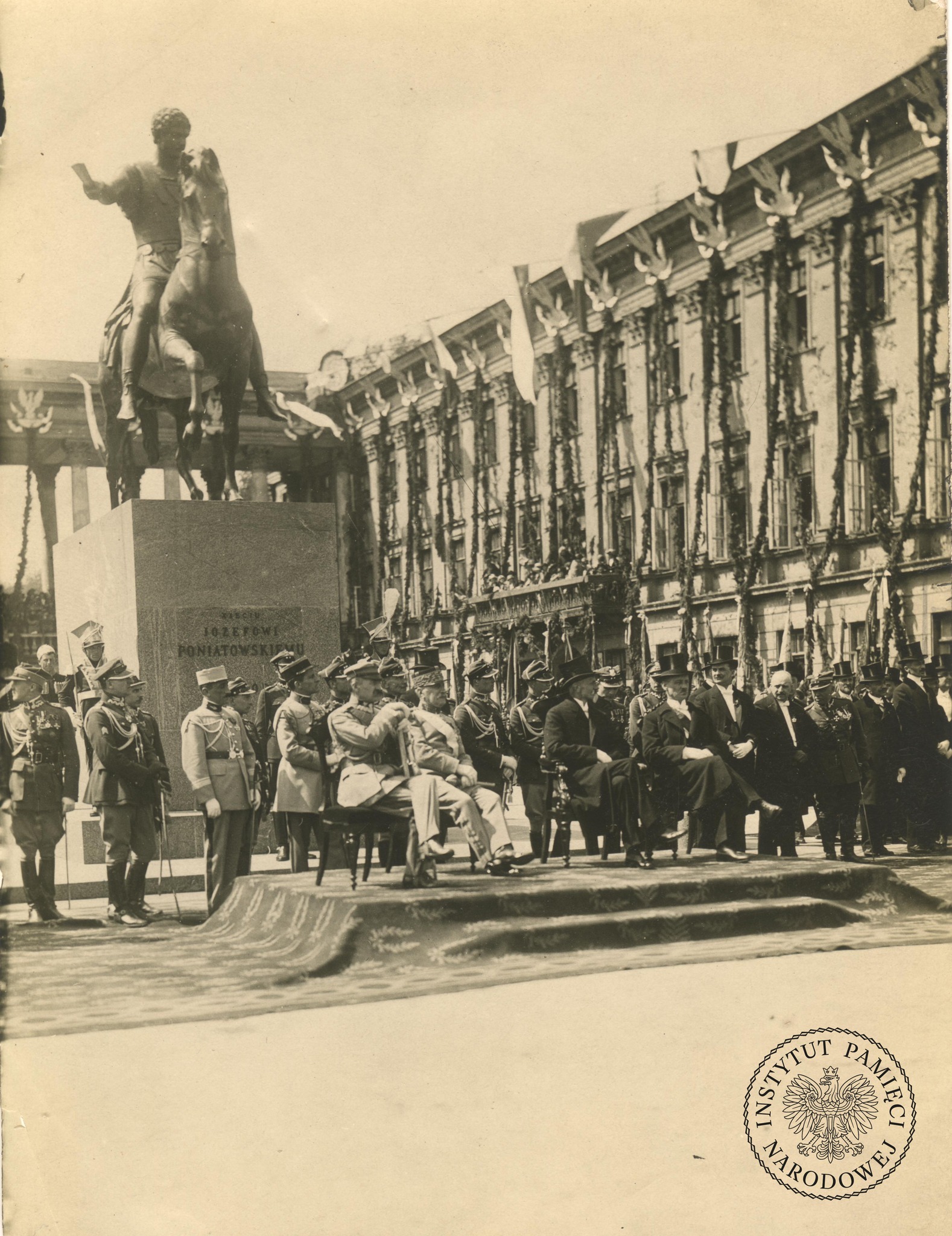 Odsłonięcie pomnika księcia Józefa Poniatowskiego na pl. Saskim (później pl. Piłsudskiego). Na zdjęciu m.in. – siedzą od lewej: marsz. Józef Piłsudski, marszałek Francji Ferdynand Foch, prezydent Stanisław Wojciechowski, premier Władysław Sikorski. Z boku widoczne udekorowane prawe skrzydło Pałacu Saskiego. Warszawa, 3 V 1923 r. (fot. z zasobu IPN)
