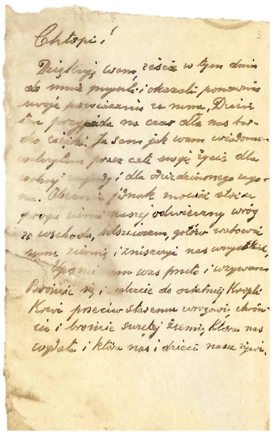 „Chłopi! Dziękuję wam, żeście w tym dniu do mnie przyszli i okazali ponownie swoje powiązanie ze mną. Dzień ten przypada na czas dla nas bardzo ciężki. Ja sam jak wam wiadomo walczyłem przez całe swoje życie dla wolnej zagrody i dla dziedziczonego zagonu. Obecnie jednak znowuż stoi u progu ziemi naszej odwieczny wróg ze wschodu – bolszewizm, gotów zrabować nam ziemię i zniszczyć nas wszystkich. Upominam was przeto i wzywam: brońcie się i walczcie do ostatniej kropli krwi przeciw staremu wrogowi, chrońcie i brońcie świętej ziemi, która nas wydała i która nas i dzieci nasze żywi”.