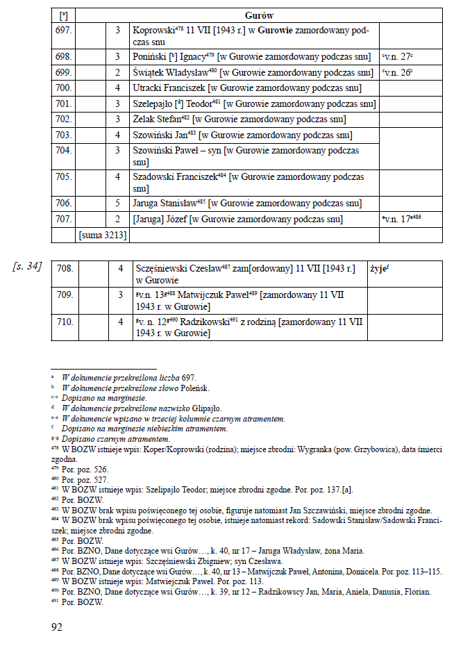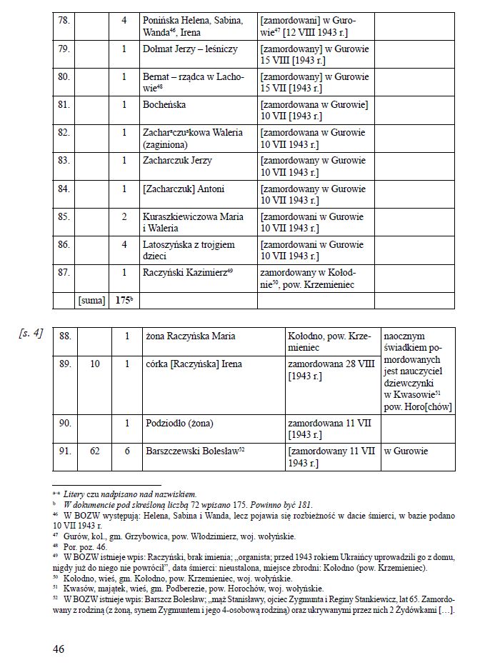 Czwarty spis osób pomordowanych w Gurowie odnaleźć można w dokumencie Dane dotyczące wsi Gurów, pow. Włodzimierz. Dokument, którego oryginał znajduje się w Bibliotece Zakładu Narodowego im. Ossolińskich, został opublikowany w pracy L. Kulińskiej i A. Rolińskiego7. Powstał on w lipcu 1943 r. i został wytworzony przez działaczy Komitetu Ziem Wschodnich we Lwowie w ramach prowadzonej przez nich akcji dokumentacyjnej, mającej na celu rejestrację osób ocalałych ze zbrodni wołyńskiej, jak również pomordowanych w jej wyniku.
