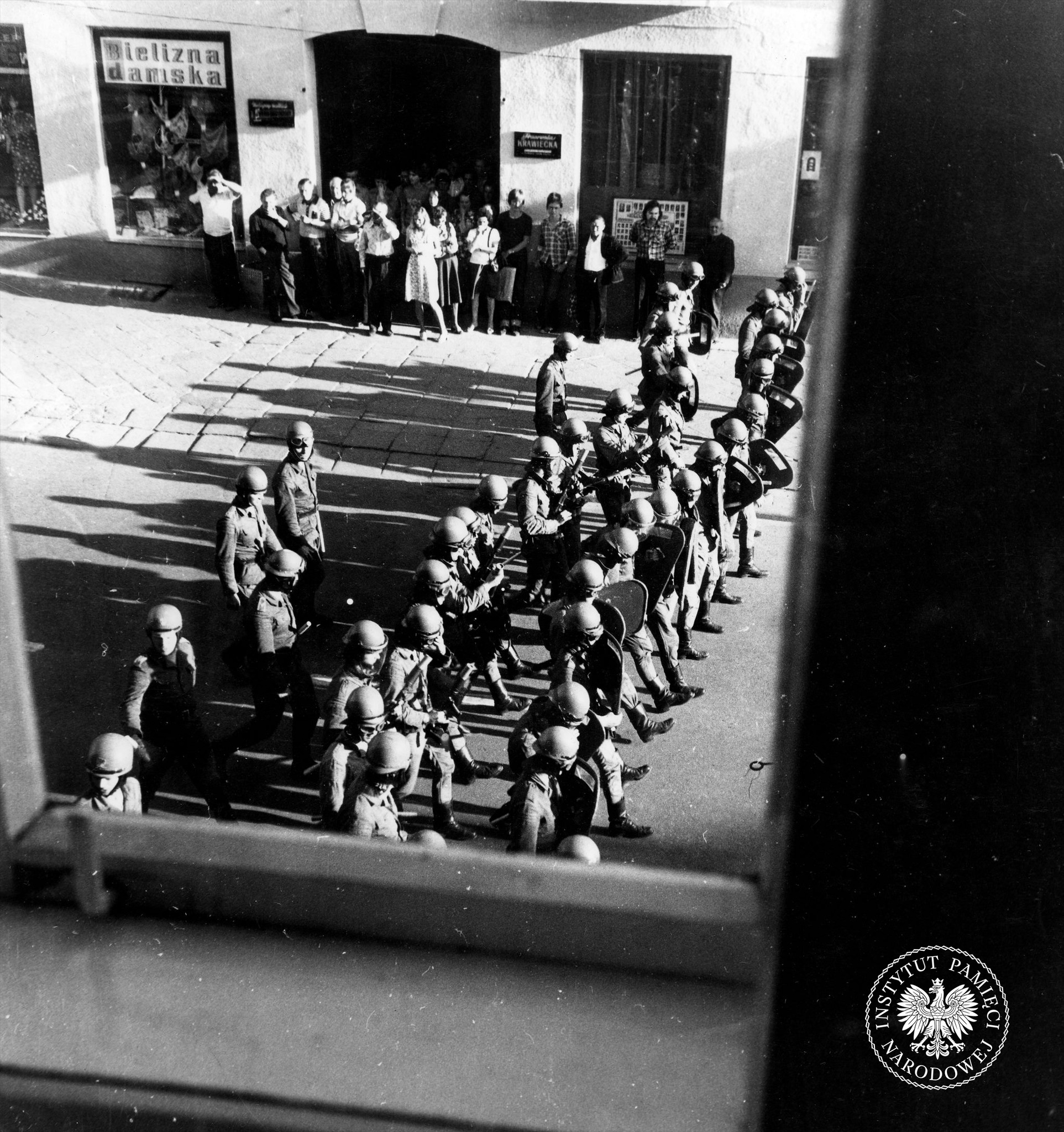 Po raz pierwszy nowe wyposażenie oddziałów zwartych milicji: tarcze ochronne, pałki szturmowe i kaski z osłoną twarzy zaprezentowano podczas pokazu w ramach ćwiczeń „Dunajec 69”. Kraków Czyżyny, 25 października 1969 r. (fot. z zasobu AIPN)