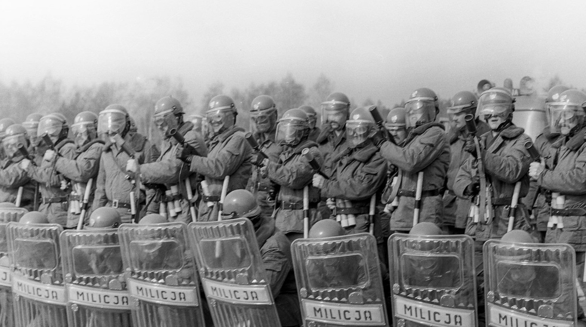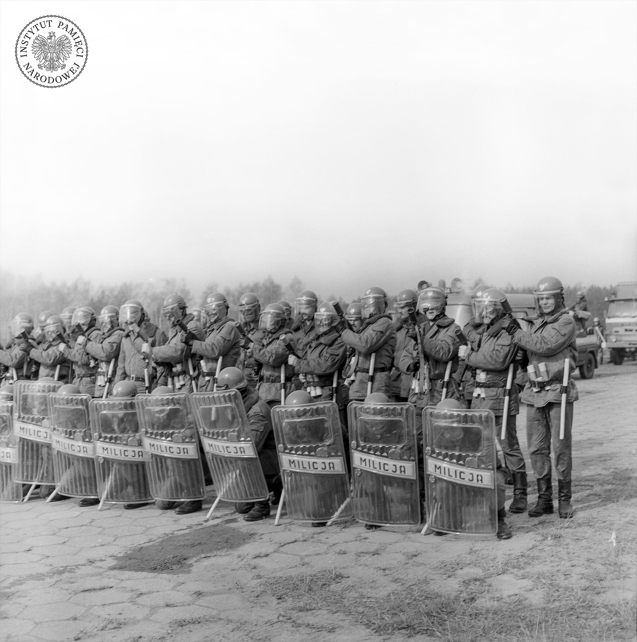 Pododdział ZOMO na ćwiczeniach na poligonie w rejonie Rzeszowa. Milicjanci w pierwszym szeregu wyposażeni w tarcze z pleksiglasu, wiosna 1982 r. (fot. z zasobu AIPN)