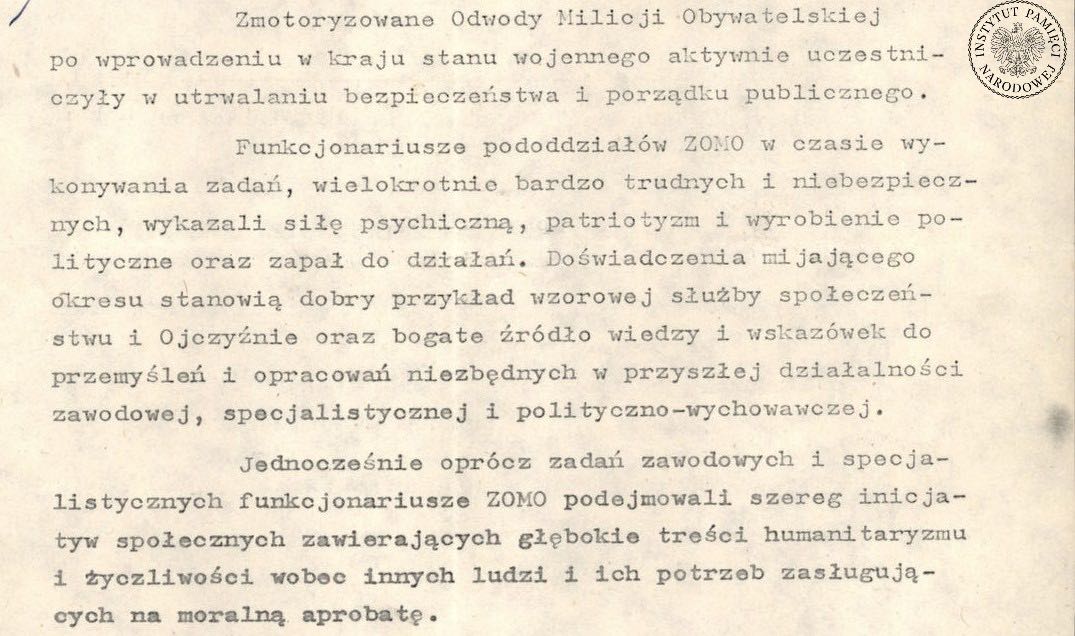 „Funkcjonariusze pododdziałów ZOMO w czasie wykonywania zadań, wielokrotnie bardzo trudnych i niebezpiecznych, wykazali siłę psychiczną, patriotyzm i wyrobienie polityczne oraz zapał do działań. (…) Jednocześnie oprócz zadań zawodowych i specjalistycznych funkcjonariusze ZOMO podejmowali szereg inicjatyw społecznych zawierających głębokie treści humanitaryzmu i życzliwości wobec innych ludzi i ich potrzeb zasługujących na moralną aprobatę”