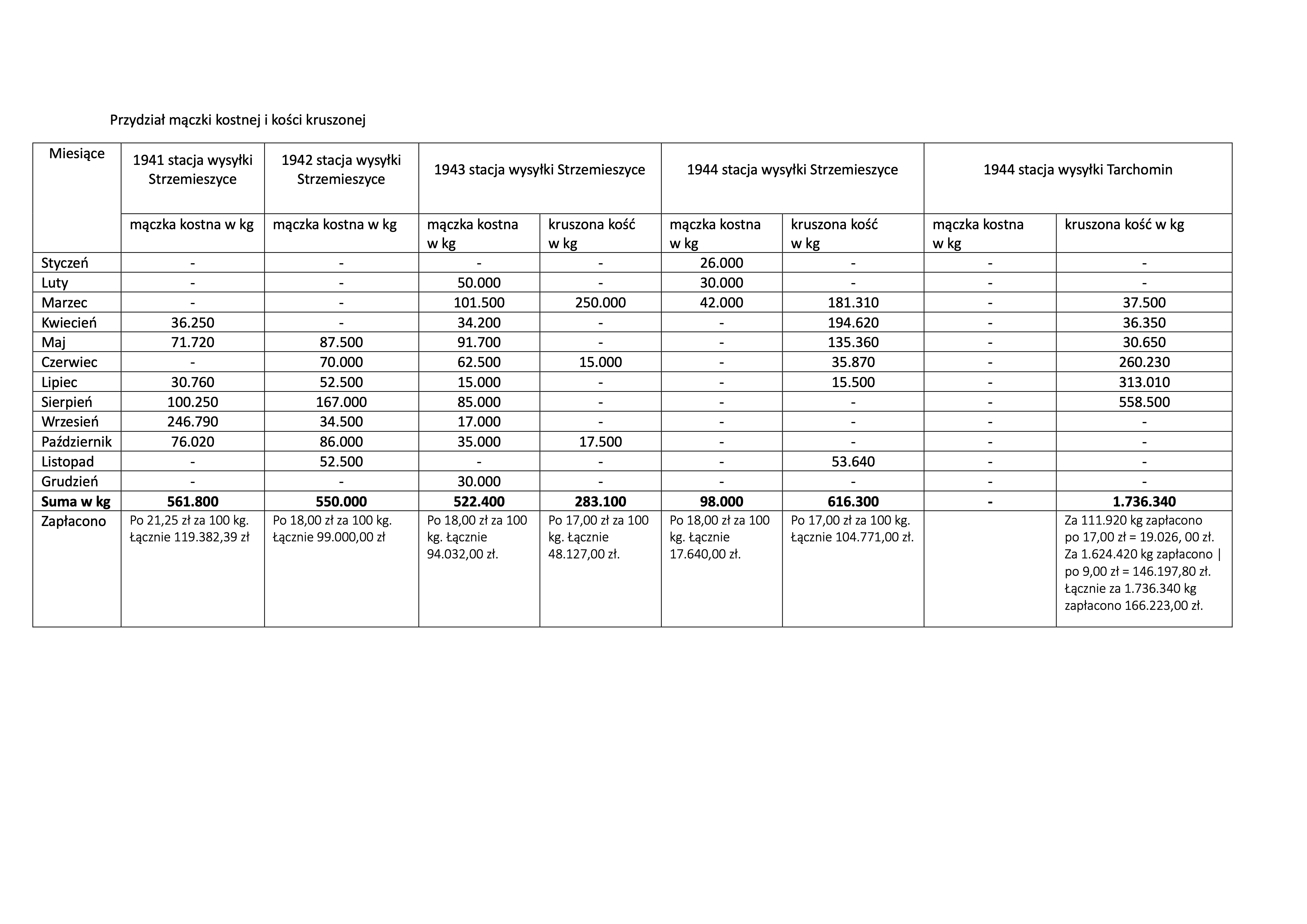 Łącznie do Zakładu przybyło 279 wagonów z kośćmi, z czego w 1943 r. przybyło 80 wagonów, a w 1944 r. było ich 88 wagonów. Kości przybywały ze stacji Oświęcim i stacji Tarchomin pod Warszawą. Po przeróbce kości dodawano do nawozów i sprzedawano.
