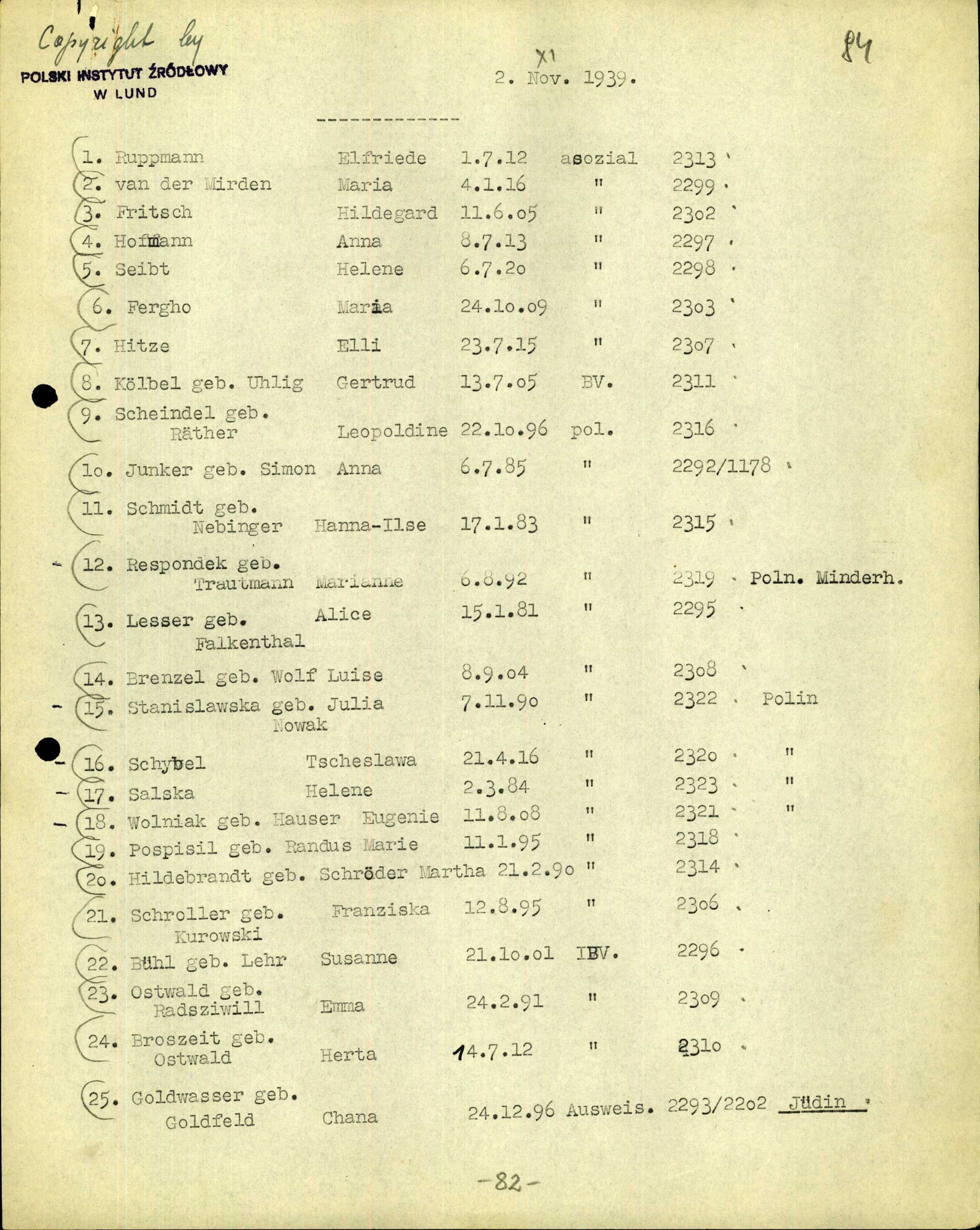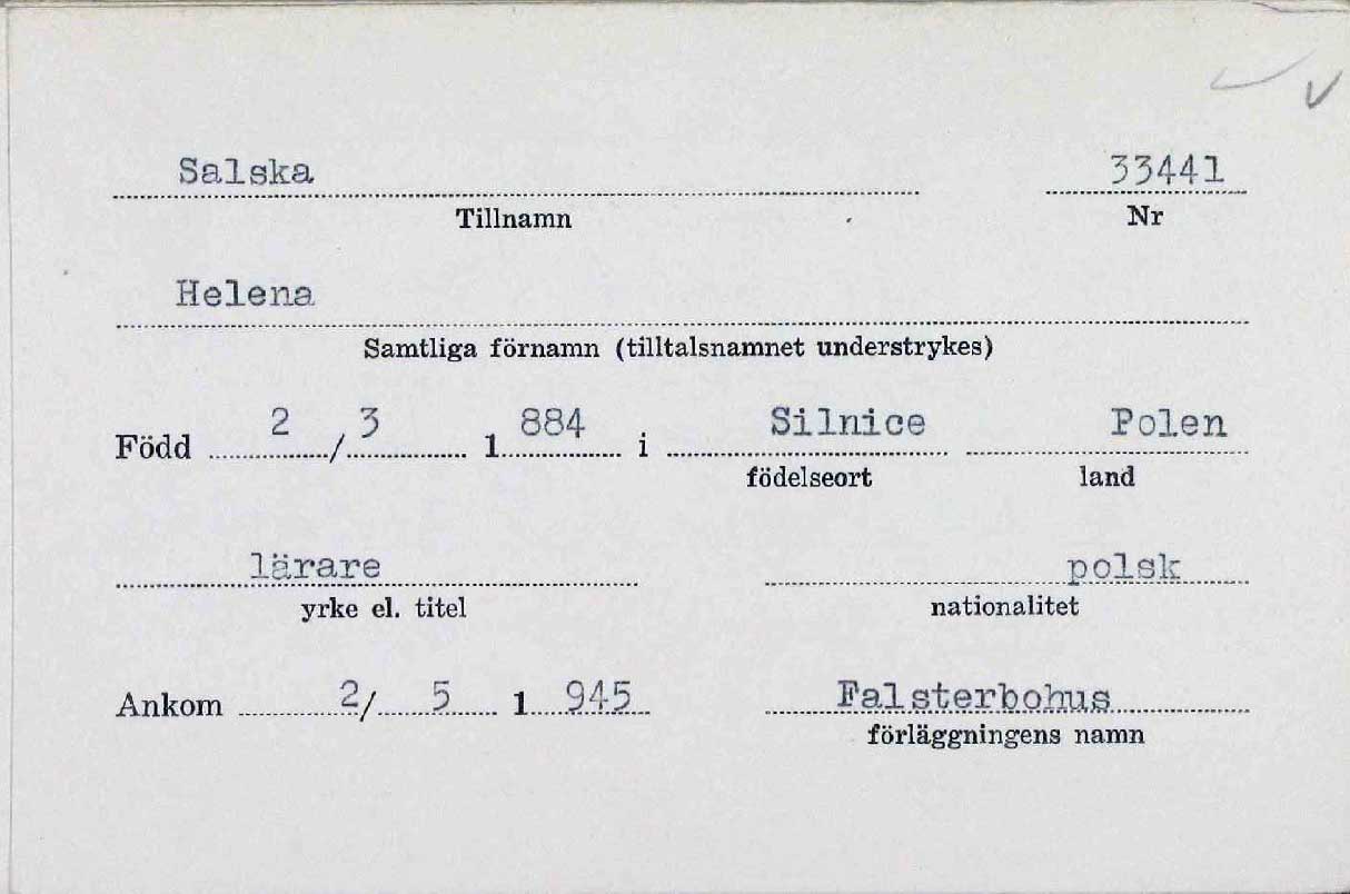 Lista Polek ewakuowanych do Szwecji dzięki interwencji Szwedzkiego Czerwonego Krzyża, pod numerem 33441 figuruje Helena Salska (źródło: baza Arolsen Archives)