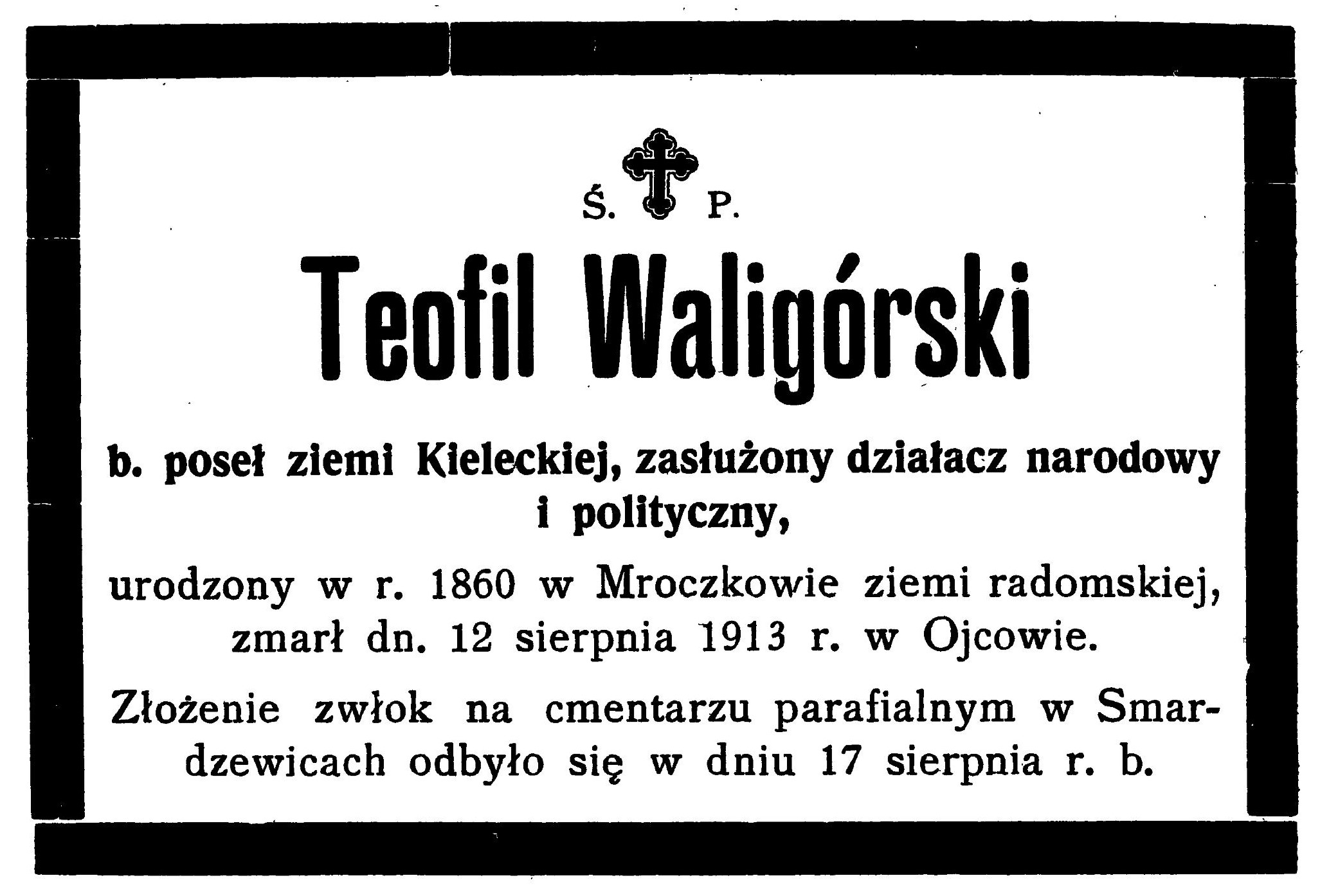 – tymi słowami na łamach Gazety Warszawskiej Roman Dmowski pożegnał Teofila Waligórskiego, swego przyjaciela i jednego z najbliższych współpracowników, zmarłego 12 sierpnia 1913 r., którego współcześni nazywają zapomnianym współtwórcą Narodowej Demokracji.