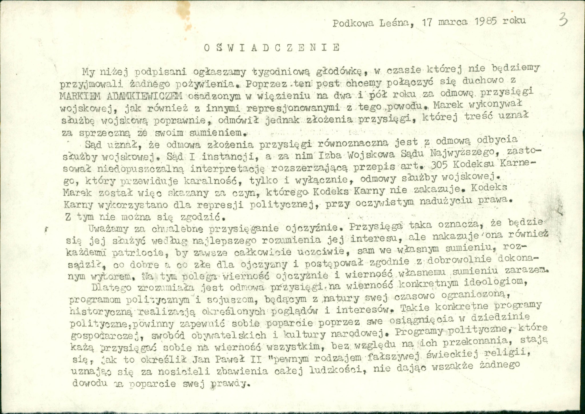 Swego poparcia protestującym udzielili przywódcy Regionalnej Komisji Wykonawczej Regionu Mazowsze NSZZ „Solidarność”, odczytano również przesłany głodującym list od Lecha Wałęsy. Wywiadu dla „Tygodnika Mazowsze” udzielił Jacek Czaputowicz, podkreślając w nim, że zorganizowana głodówka w obronie Adamkiewicza w szerszej perspektywie dotyczy walki o poszanowanie godności osoby ludzkiej również w wojsku i zwrócenie uwagi przez zachodnie ruchy pacyfistyczne na zagrożenie dla pokoju, jakim jest zniewolenie.Zapowiedział dyskusję nad kwestią powołania niezależnego ruchu pokojowego w Polsce. Na zakończenie protestu jego uczestnicy wystosowali list do papieża Jana Pawła II, odpowiadając tym samym na Jego orędzie na XVIII Światowy Dzień Pokoju „Pokój i młodzi idą razem”.