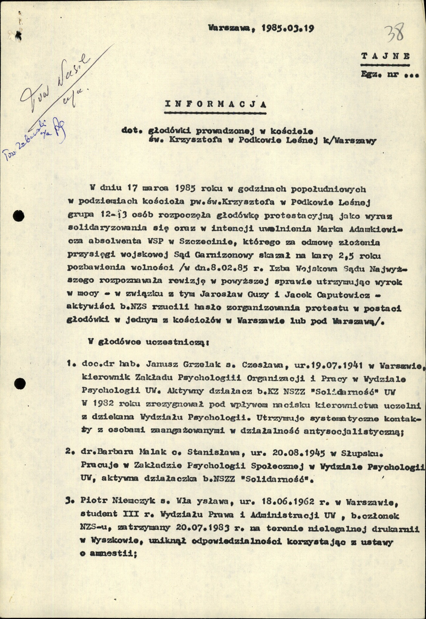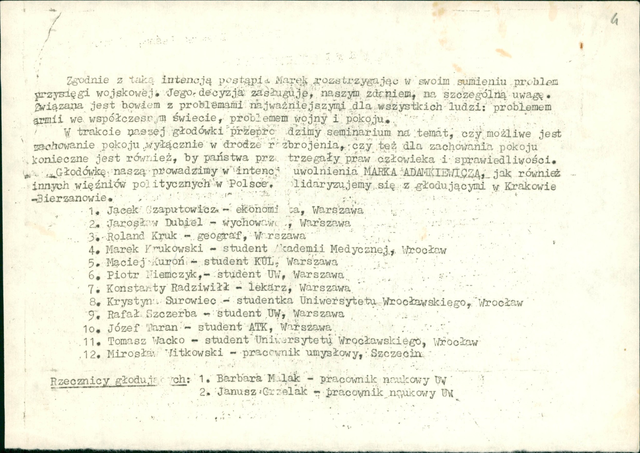 Rzecznikami głodujących byli pracownicy naukowi UW: Barbara Malak i Janusz Grzelak. Również gospodarz – proboszcz parafii ks. Leon Kantorski – w geście solidarności zapowiedział post o chlebie i wodzie.