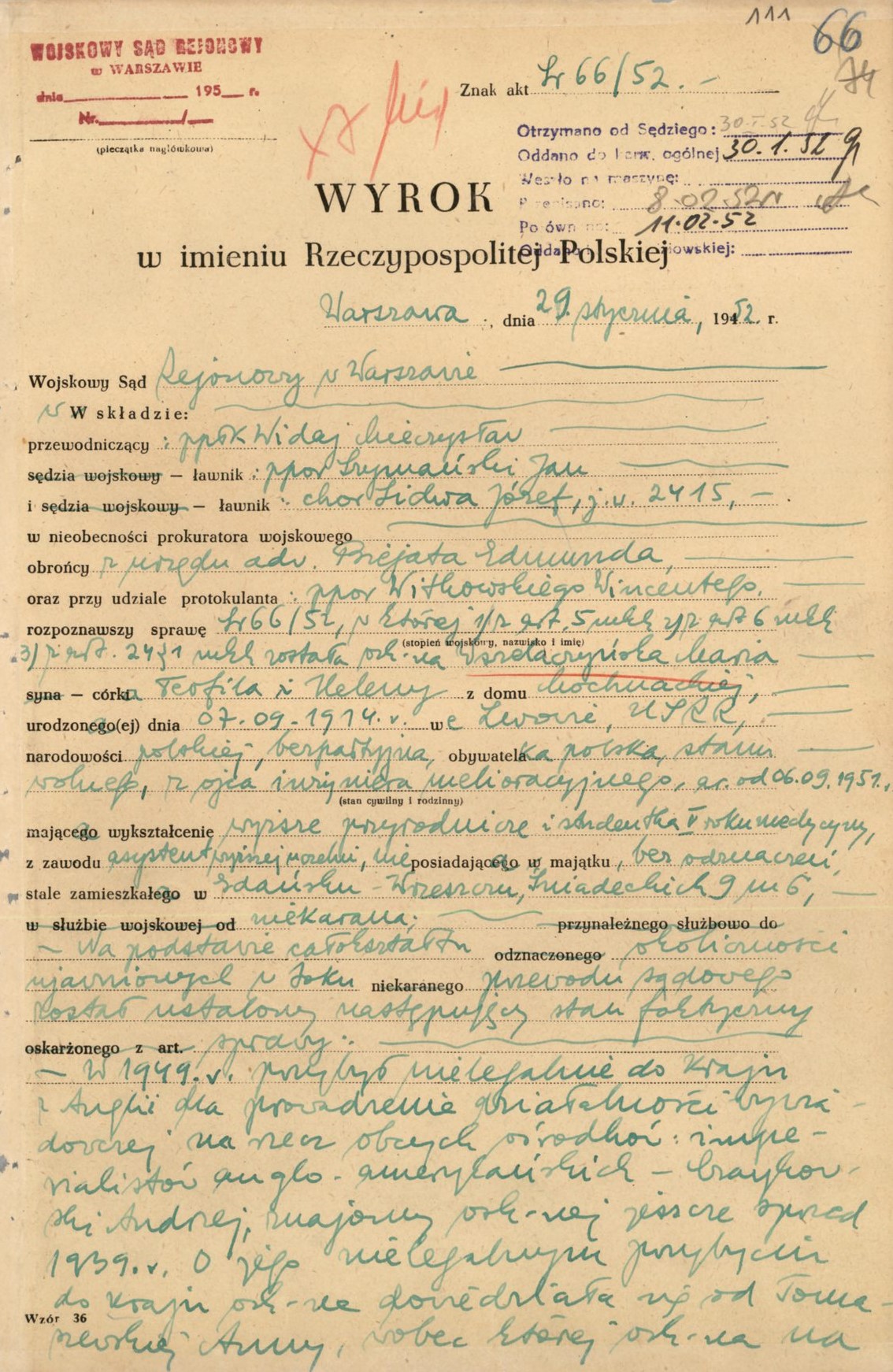 29 stycznia 1952 r. Wojskowy Sąd Rejonowy w Warszawie skazał ją na 8 lat więzienia, pozbawienie praw publicznych i obywatelskich praw honorowych na okres 4 lat oraz przepadek mienia. Karę odbywała m.in. w więzieniu dla kobiet w podbydgoskim Fordonie. W 1955 r. zmniejszono jej wyrok do 3,5 roku więzienia i jednocześnie nakazano zwolnienie.