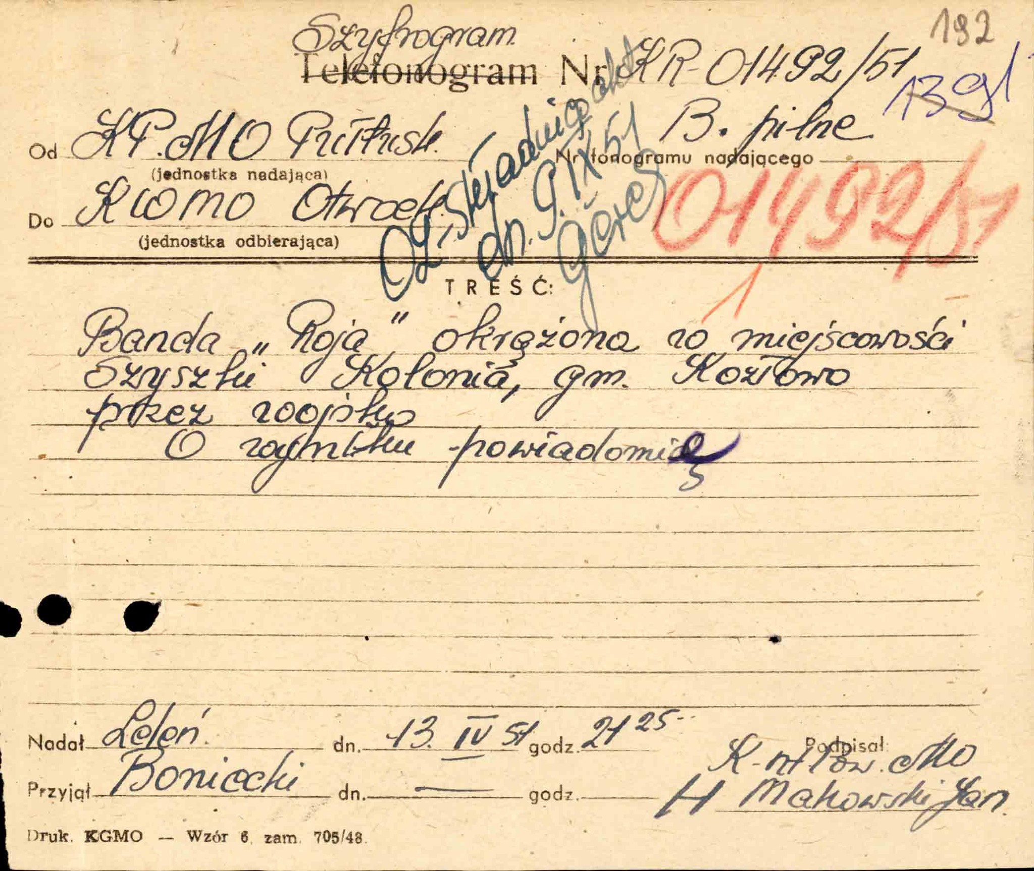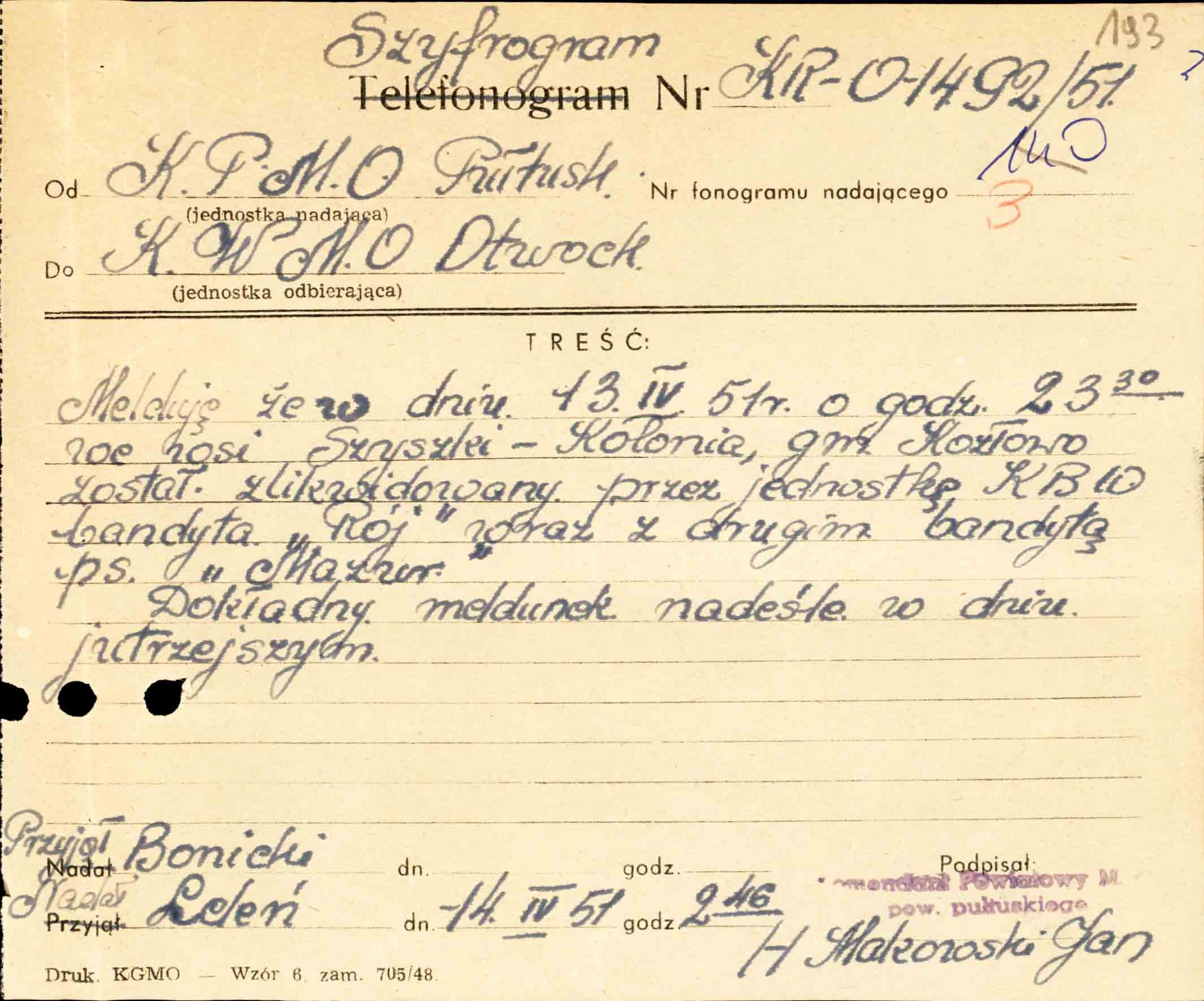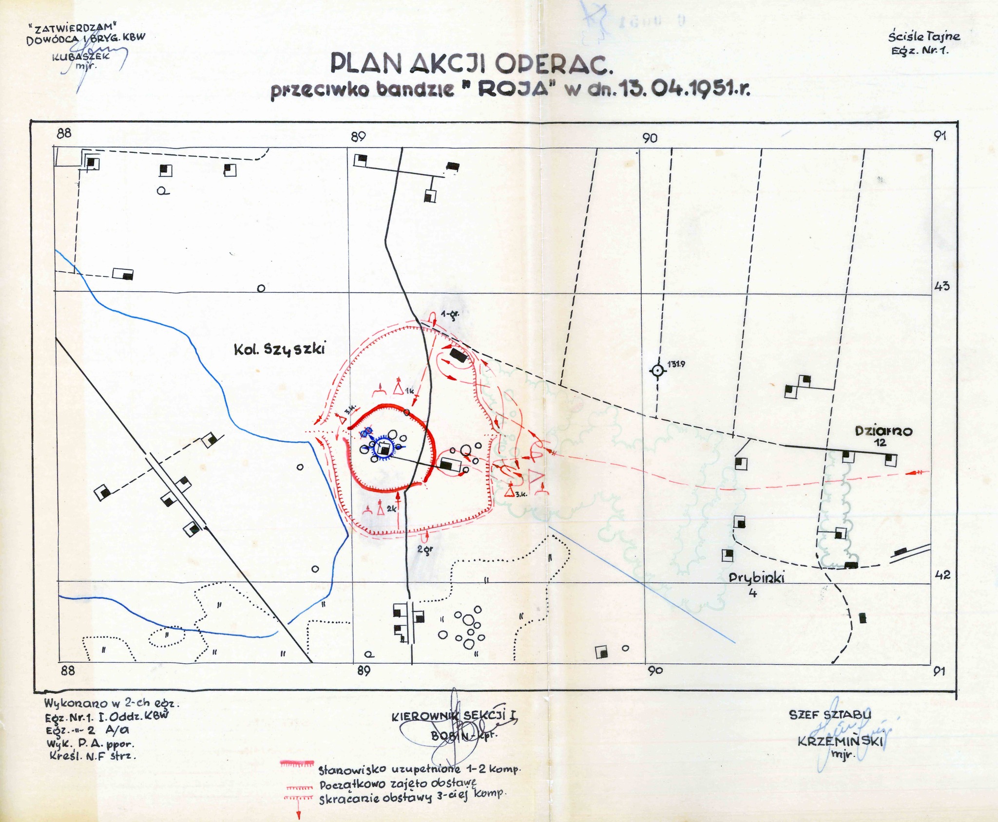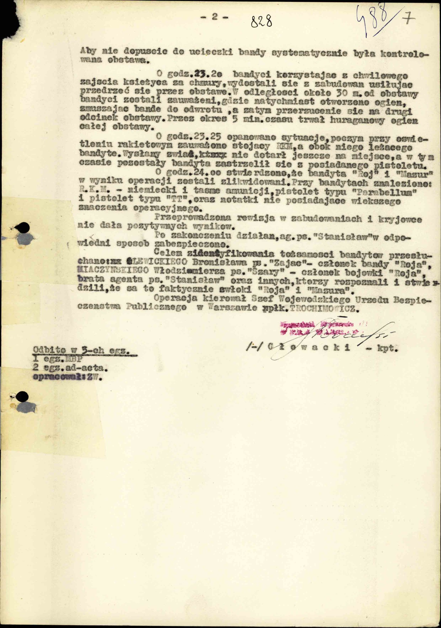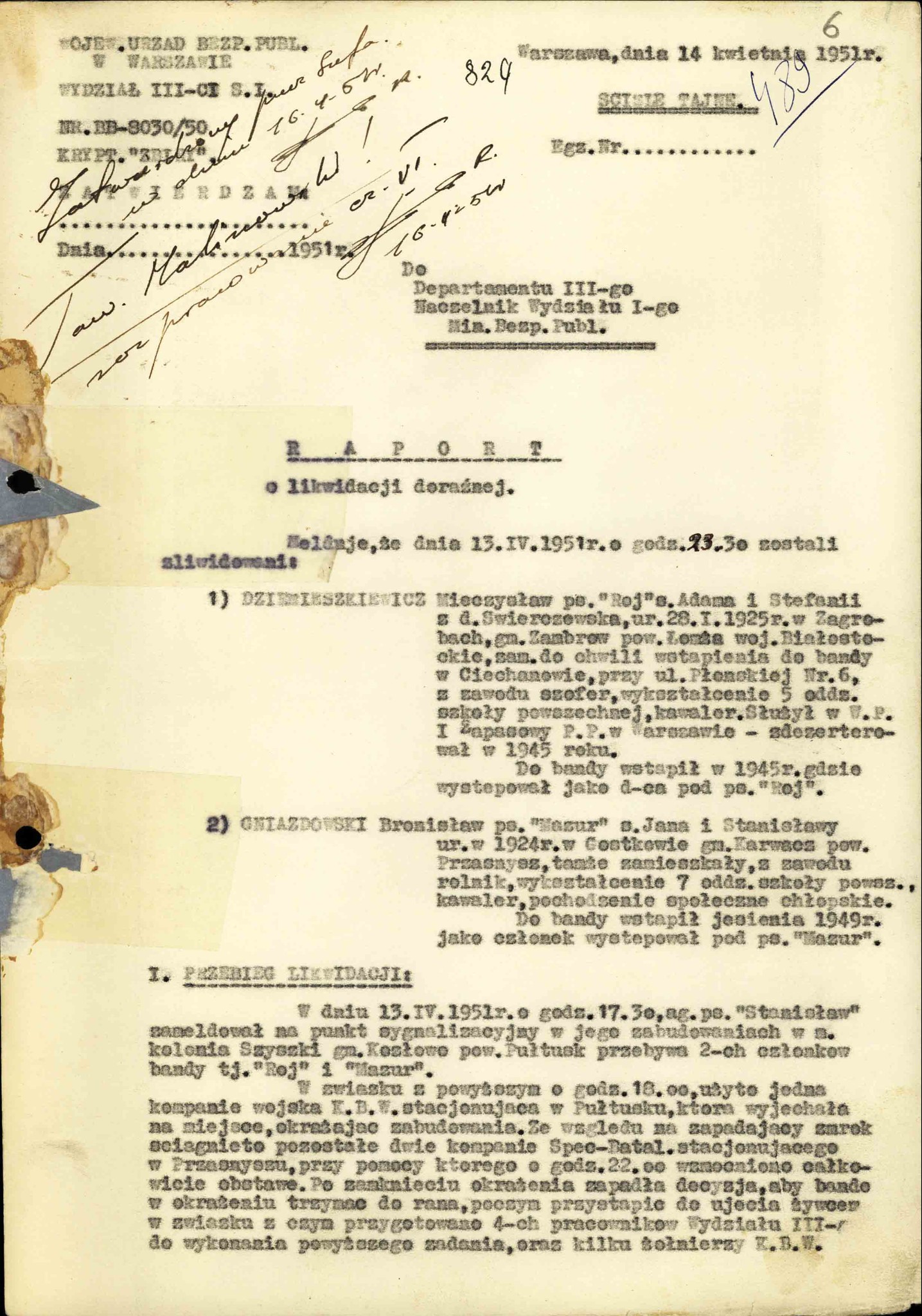 „Raport o likwidacji doraźnej” dotyczący śmierci st. sierż. Mieczysława Dziemieszkiewicza„Roja” i Bronisława Gniazdowskiego „Mazura”, złożony przez kpt. Eugeniusza Głowackiego, naczelnika Wydziału III WUBP w Warszawie, 14 IV 1951 r. (z zasobu IPN)