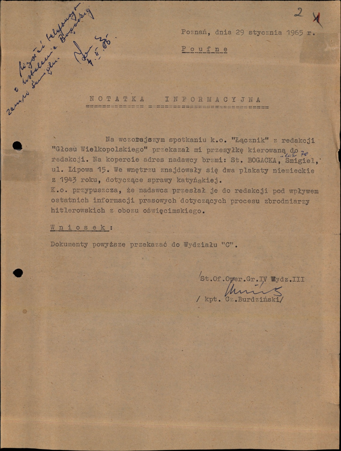 Koperta zaadresowana do redakcji „Głosu Wielkopolskiego” w Poznaniu, w której zgodnie z notatką znajdowały się opublikowane w 1943 r. plakaty dotyczące zbrodni katyńskiej. Śmigiel, 11 stycznia 1965 r. (z zasobu AIPN)