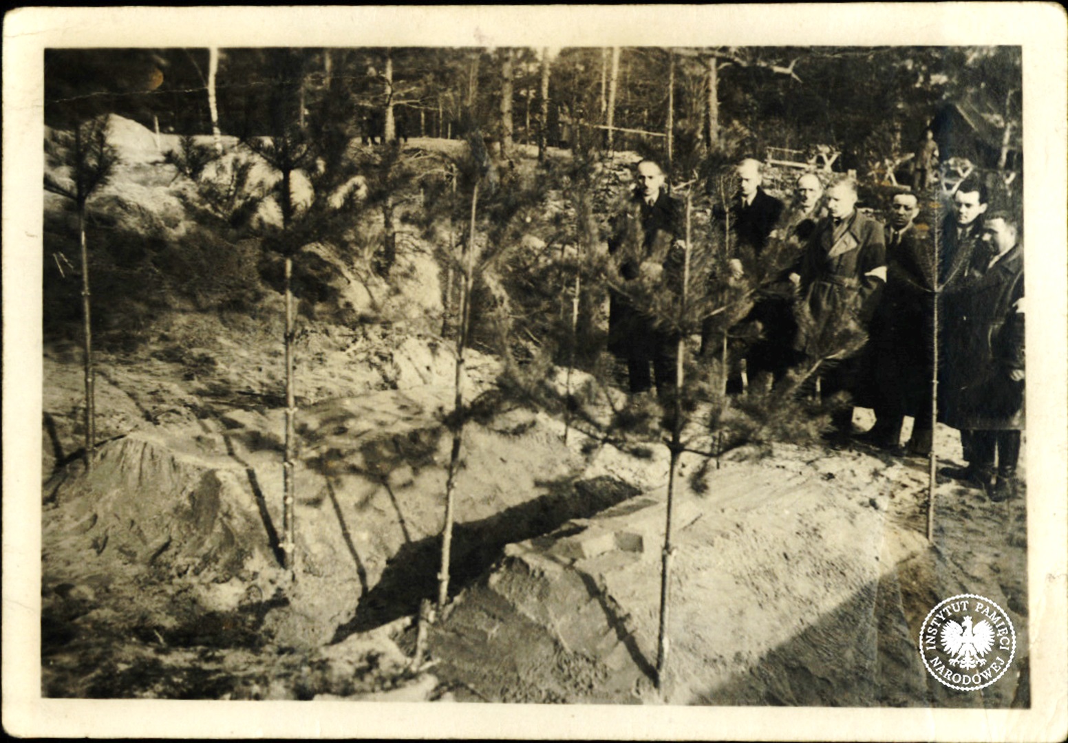 Przy grobach gen. Mieczysława Smorawińskiego i gen. Bronisława Bohaterewicza w lesie katyńskim stoją członkowie Komisji Technicznej PCK. Od lewej: por. Hugon Kassur, Stefan Kołodziejski, Jerzy Wodzinowski, Gracjan Jaworowski, dr Marian Wodziński, szofer Adam Godzik (prawdopodobnie 29 kwietnia) 1943 r. (fot. z zasobu AIPN)