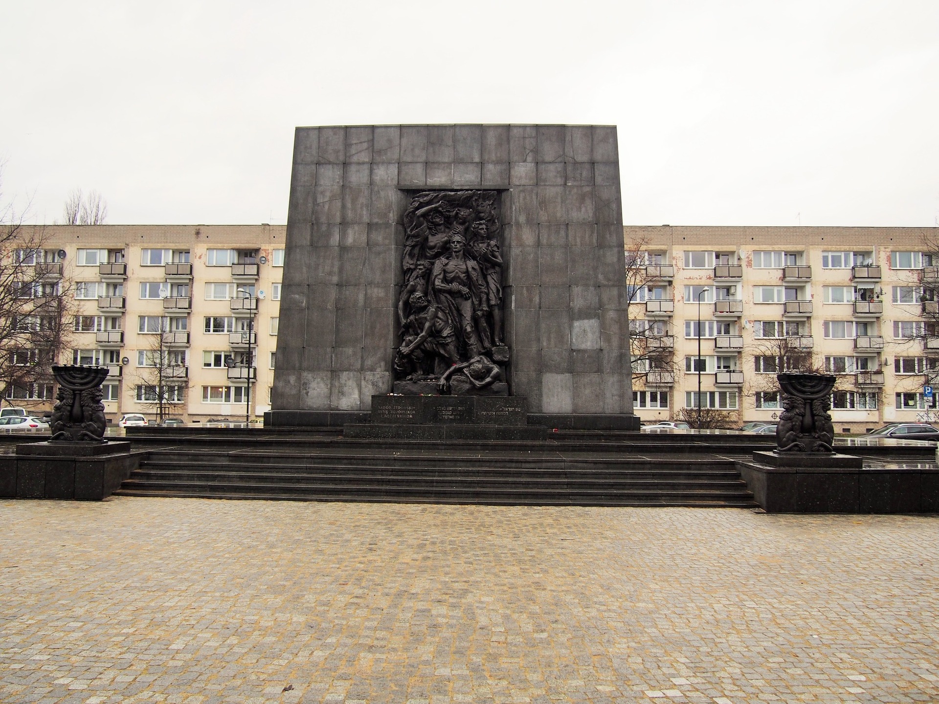 Kamienną płytę przed pomnikiem zdobią dwie siedmioramienne menory.