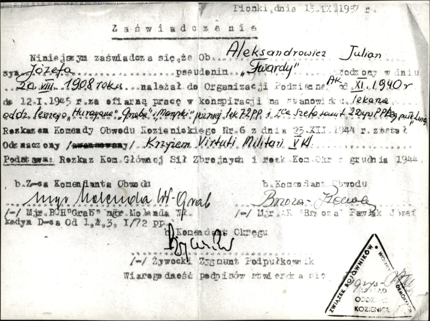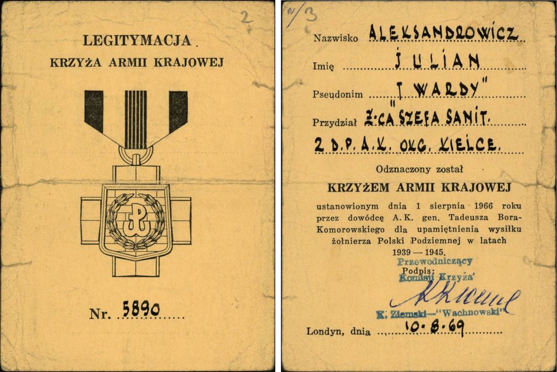 Po włączeniu zalążków 72. Pułku Piechoty AK do 3. Pułku Piechoty Legionów AK Julian Aleksandrowicz został przeniesiony na stanowisko zastępcy szefa sanitariatu 2. Dywizji Piechoty Legionów AK i z tą formacją wziął udział w walkach z okupantem niemieckim. Przez żołnierzy AK, z których wielu zawdzięczało mu życie i zdrowie, nazywany był „Doktorem Twardym”.