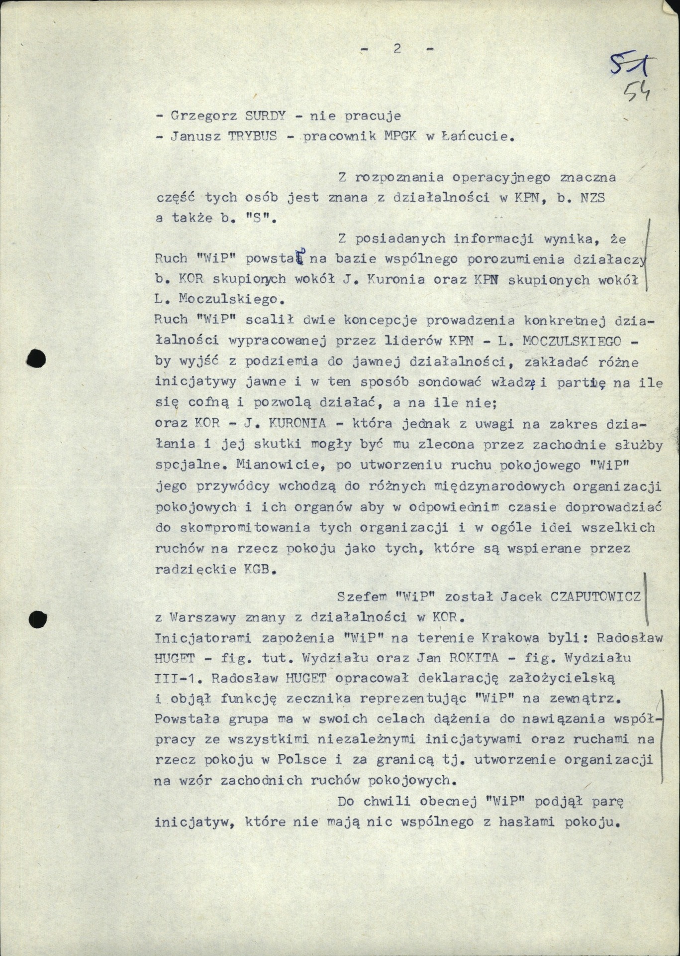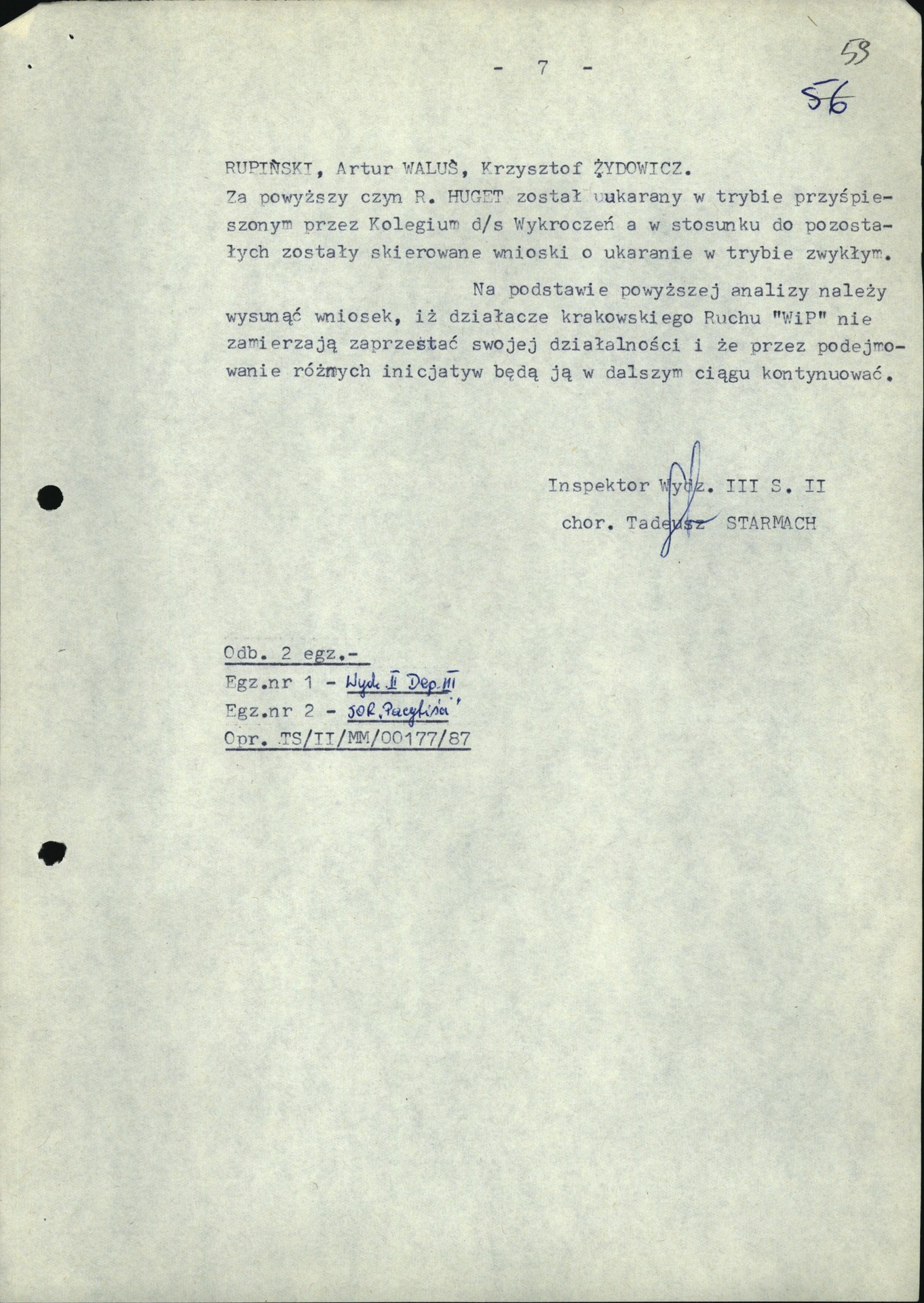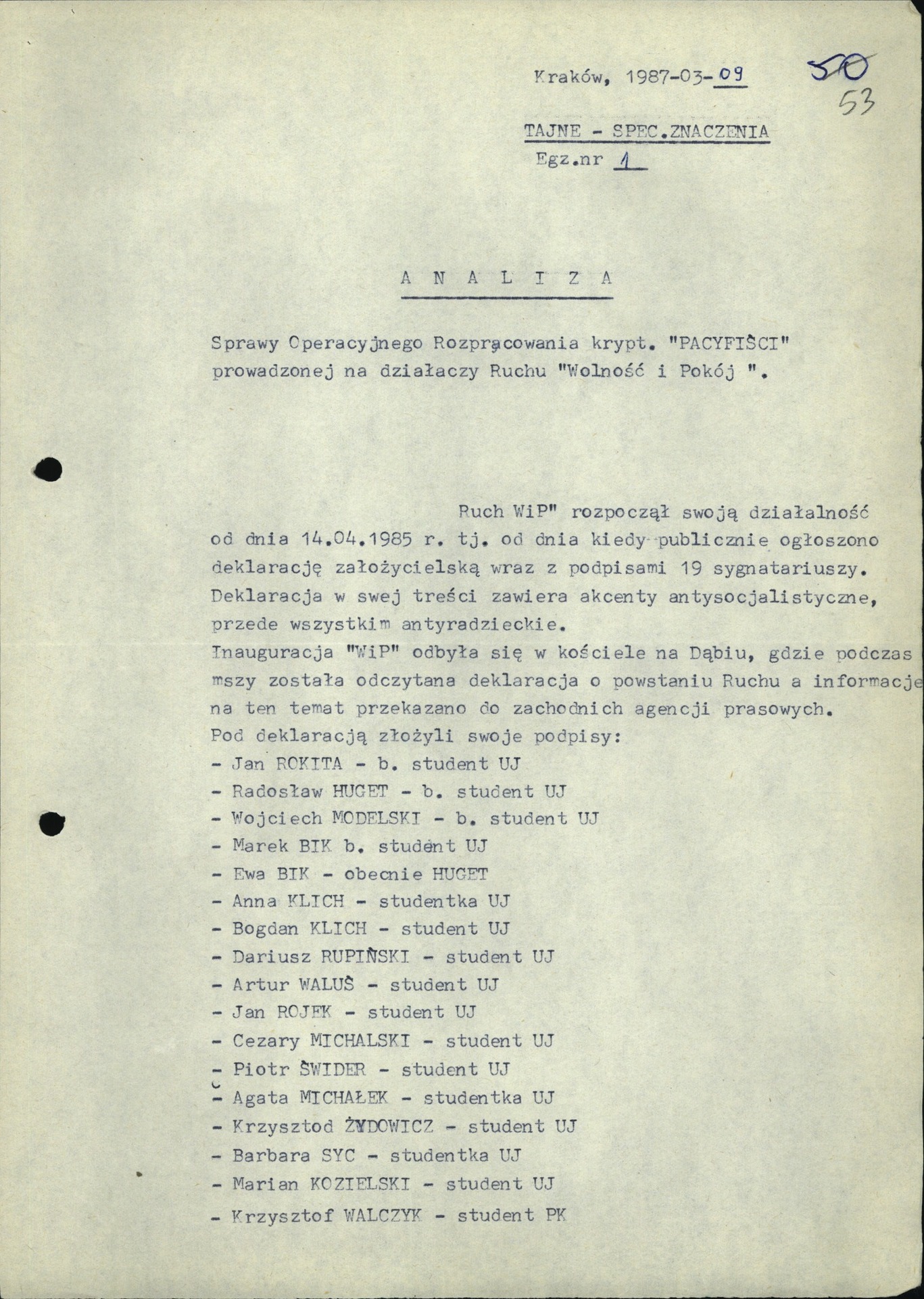 Analiza SOR krypt. „Pacyfiści” prowadzonej wobec działaczy Ruchu „Wolność i Pokój”. Kraków, 9 III 1987 r. (z zasobu IPN)
