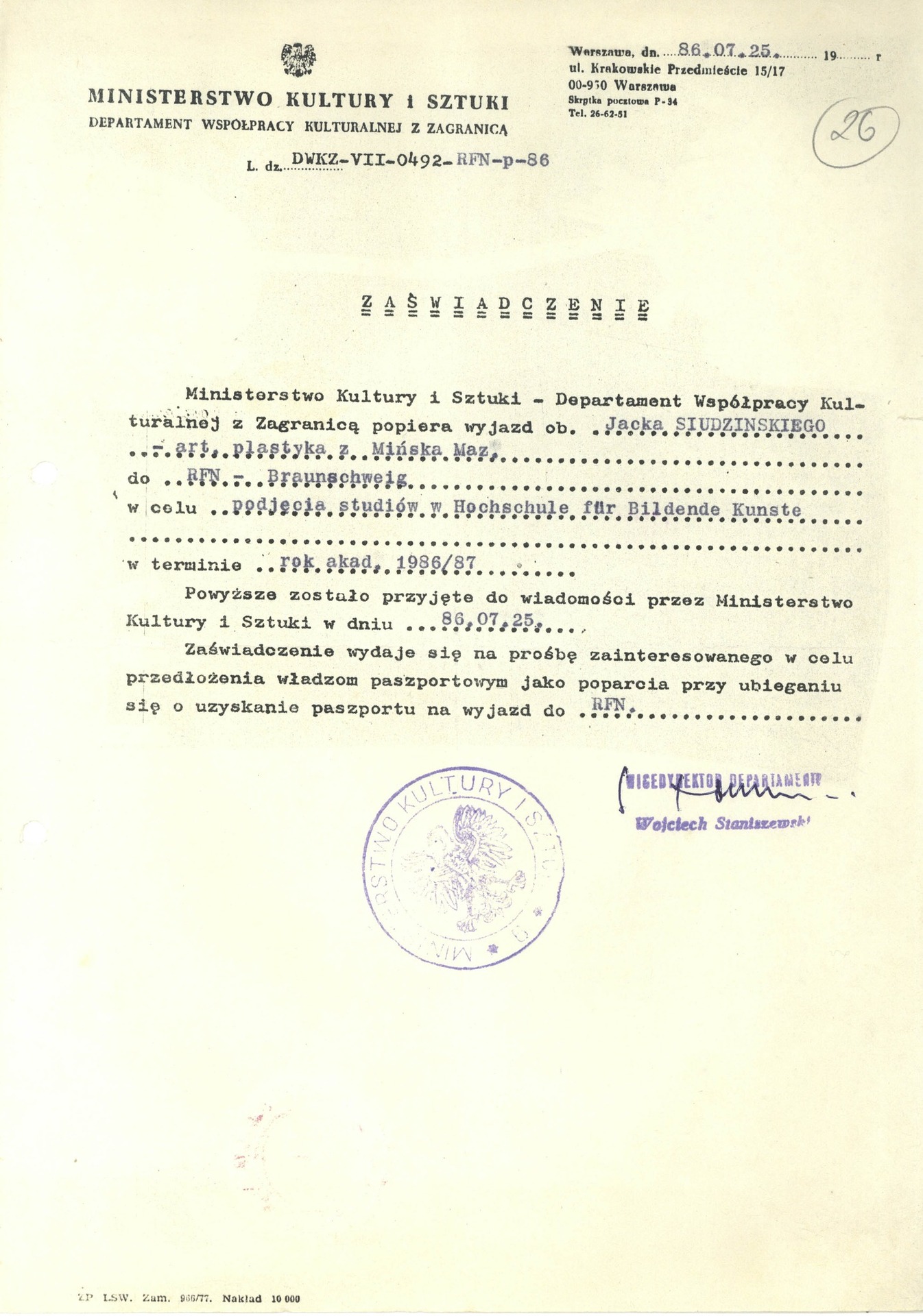 W zasobie archiwalnym Instytutu Pamięci Narodowej znajdują się akta paszportowe Jacka Wojciecha Siudzińskiego, obrazujące pośrednio drogę artystyczną malarza. Ww. figuruje również w Kartotece odtworzeniowej b. Biura „C” MSW (był rejestrowany przez Wydz. I WUSW w Siedlcach w 1986 r. w kategorii zabezpieczenie operacyjne) oraz w Kartotece paszportowej Biura Paszportów MSW.