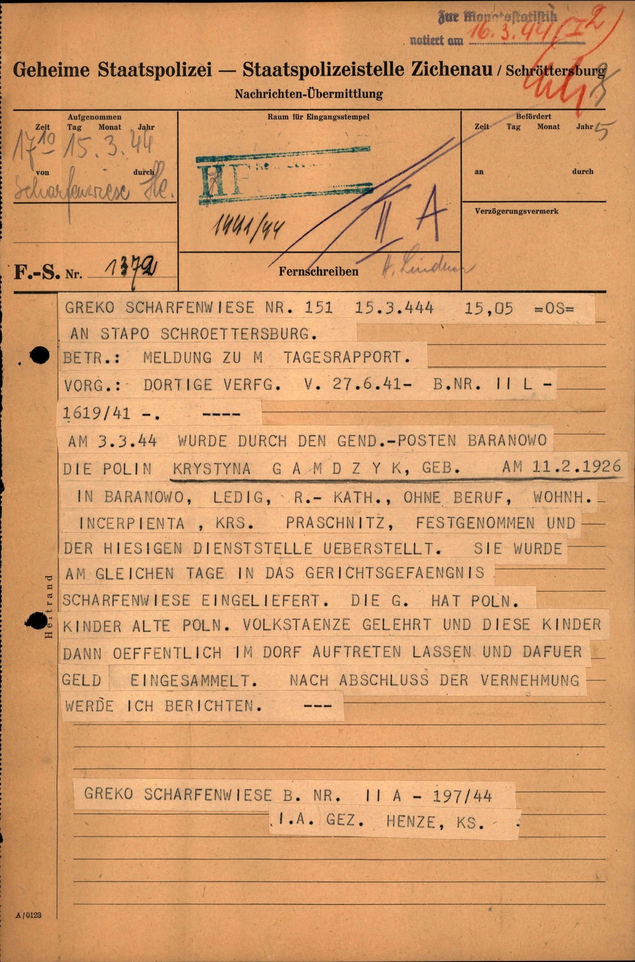 W przechowywanym w AIPN zespole akt Tajnej Policji Państwowej Oddział w Ciechanowie/Płocku znajdują się dokumenty dotyczące Krystyny Gamdzyk, która została aresztowana w 1944 r. pod zarzutem nauczania dzieci polskich tańców ludowych. Po upomnieniu została zwolniona.