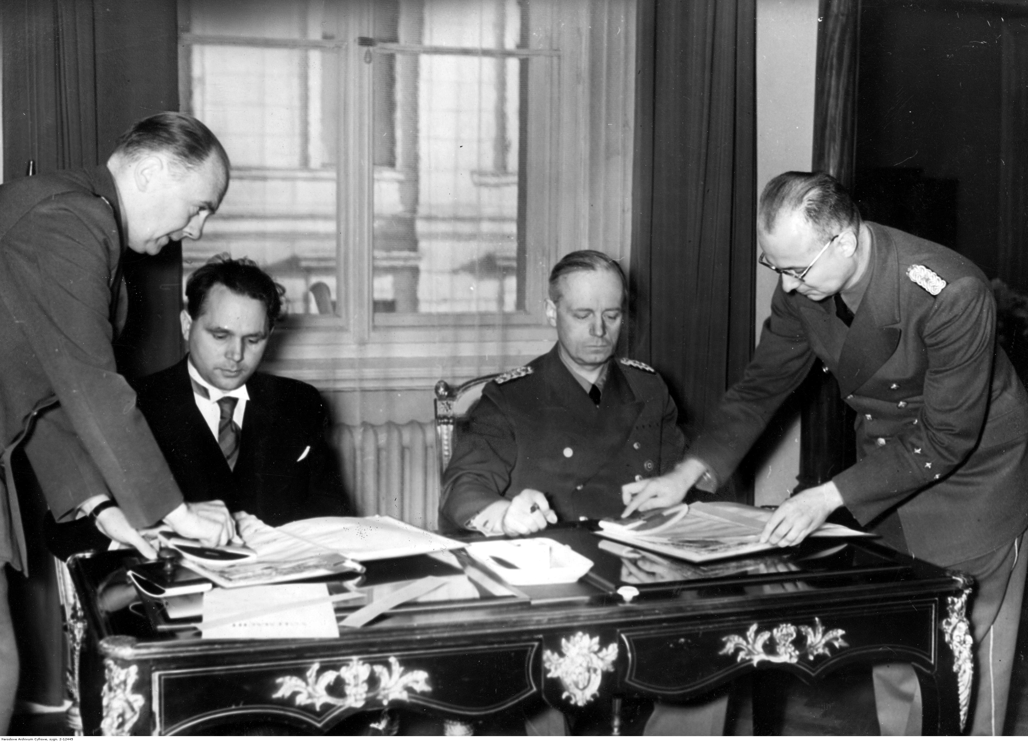 Salzburg. Wizyta Jozefa Tiso i Cernaka - 29.07.1940 r. Prezydent Słowacji Jozef Tiso (pierwszy z prawej) i poseł słowacki w Berlinie Matusz Cernak (za Tiso pierwszy z prawej) przechodzą przed frontem kompanii honorowej. Widoczny również minister spraw zagranicznych III Rzeszy Joachim von Ribbentrop (z lewej). (NAC)