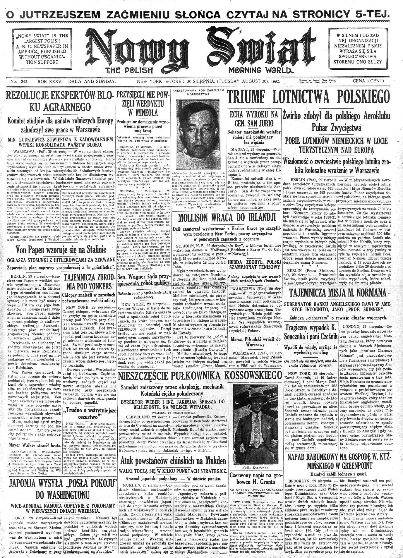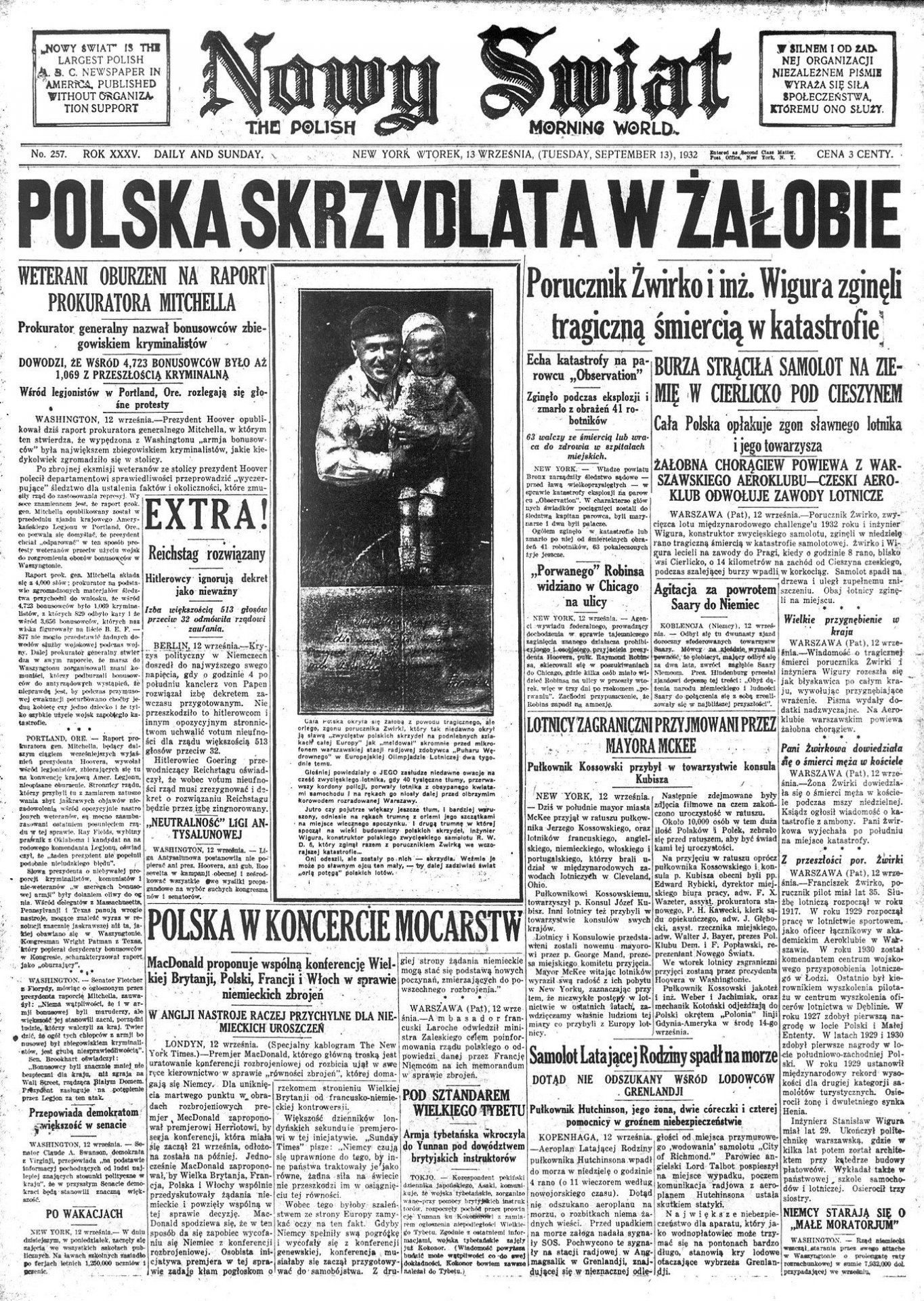 Porucznik Żwirko i inż. Wigura zginęli tragiczną śmiercią w katastrofie - smutne wieści z pierwszej strony wychodzącego w Nowym Jorku dziennika polonijnego „Nowy Świat” (nr 257 z 13 września 1932 r.). Z zasobu IPN (zbiór kopii cyfrowych dziennika „Nowy Świat” z lat 1920-1970 pozyskanych do zasobu IPN z Instytutu Józefa Piłsudskiego w Ameryce)